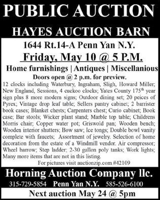 SALE: 5201 County Rt 8, Avoca, NY. May 9th, 10th & 11th, 9am - 4pm. Electronic key- board, clothes, dishes, outside chairs, furniture, ab-lounger, exercise mats, ladies bike, Tupperware, ladders, linens, comforters, designer bags, kitchen chairs, lawn roller, microwave, holiday decorations, Victorian doll house & much more!