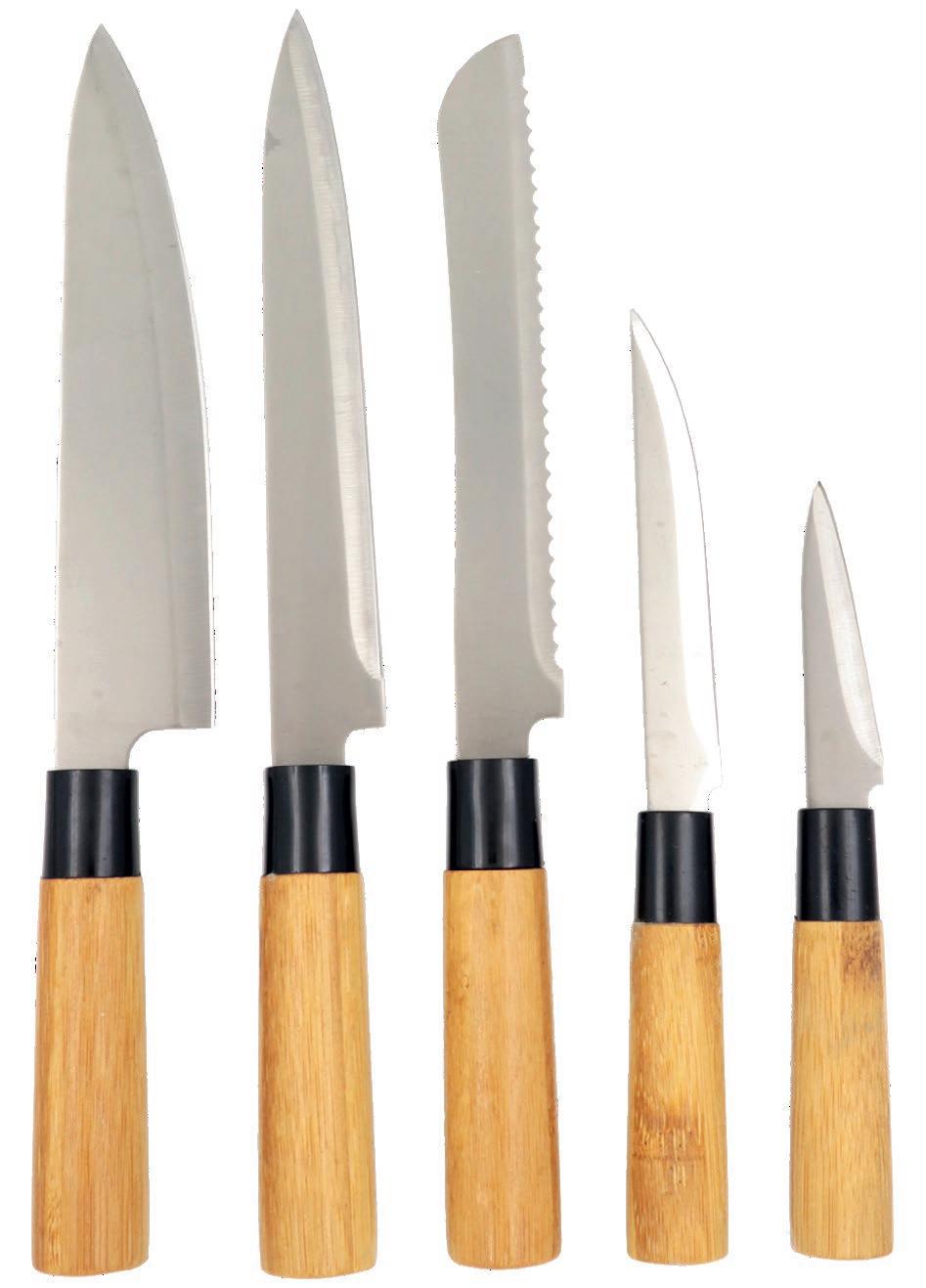 Deze set van 5 hoogwaardige messen bevat alles wat u nodig heeft in de keuken: een koksmes (33,8 cm), broodmes (33 cm), vleesmes (34,2 cm), snijmes (25 cm) en schilmes (20 cm). Elk mes is zorgvuldig ontworpen voor precisie en duurzaamheid, perfect voor verschillende snijtaken, van brood en vlees tot het schillen van fruit en groenten. Een essentiële set voor elke thuiskok of professionele chef.