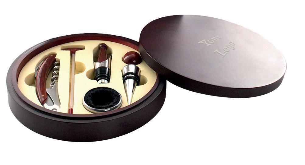 Wijnset van elegant cirkelvormig ontwerp met natuurlijk hout afwerking. Toebehoren van roestvrij staal en hout. Inclusief kurkentrekker met capsuleafsnijder en -opener, stop, dispenser, druppelstop en thermometer. Gepresenteerd in een individuele doos met zacht, beige, gestanst schuim aan de binnenkant.
