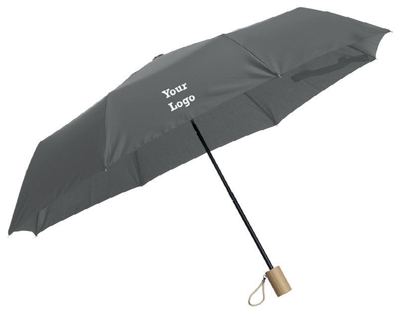 Opvouwbare paraplu van 190T RPET pongee polyester (gerecycled van PET-flessen). Met RVS frame en steel, mooie bamboe handgreep met katoenen lus, klittenbandsluiting, opberghoes en RPET label. Manuele bediening.