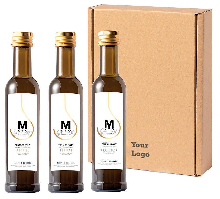 Set van Premium Gouden olie in 3 glazen flessen van 250 ml. Extra Virgin kwaliteit en in de variëteiten Picual (2 fl essen) en Arbequina (1 fl es). Zeer intens en vroeg geoogste oliën, waardoor de beste organoleptische eigenschappen worden gegarandeerd, met behulp van een koud extractieproces. Gemaakt in Spanje en gepresenteerd in een elegante kraftkartonnen doos, met een breed merkoppervlak.
