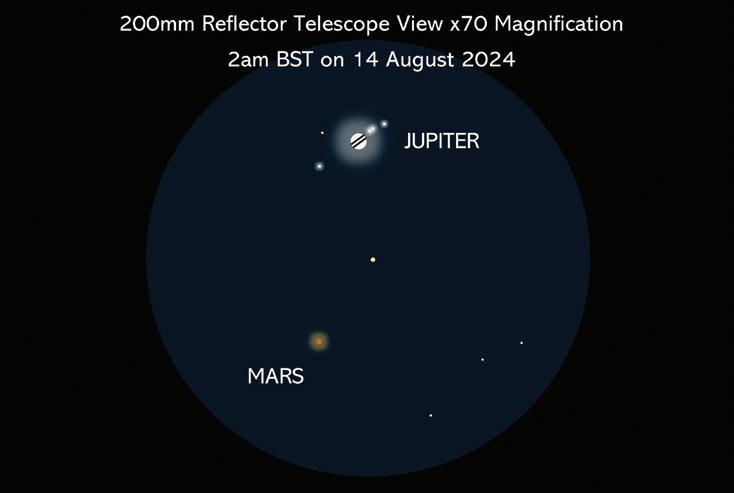 On the mornings of 14 August and 15 August Mars passes very close to Jupiter as seen from our earthbound viewpoint. Look towards the east-north-east from 1am until dawn to see this special planetary conjunction. Binoculars will get you a super view, but a 130mm+ aperture telescope should yield an exceptional scene with both Jupiter and Mars nicely framed within the same magnified field of view.