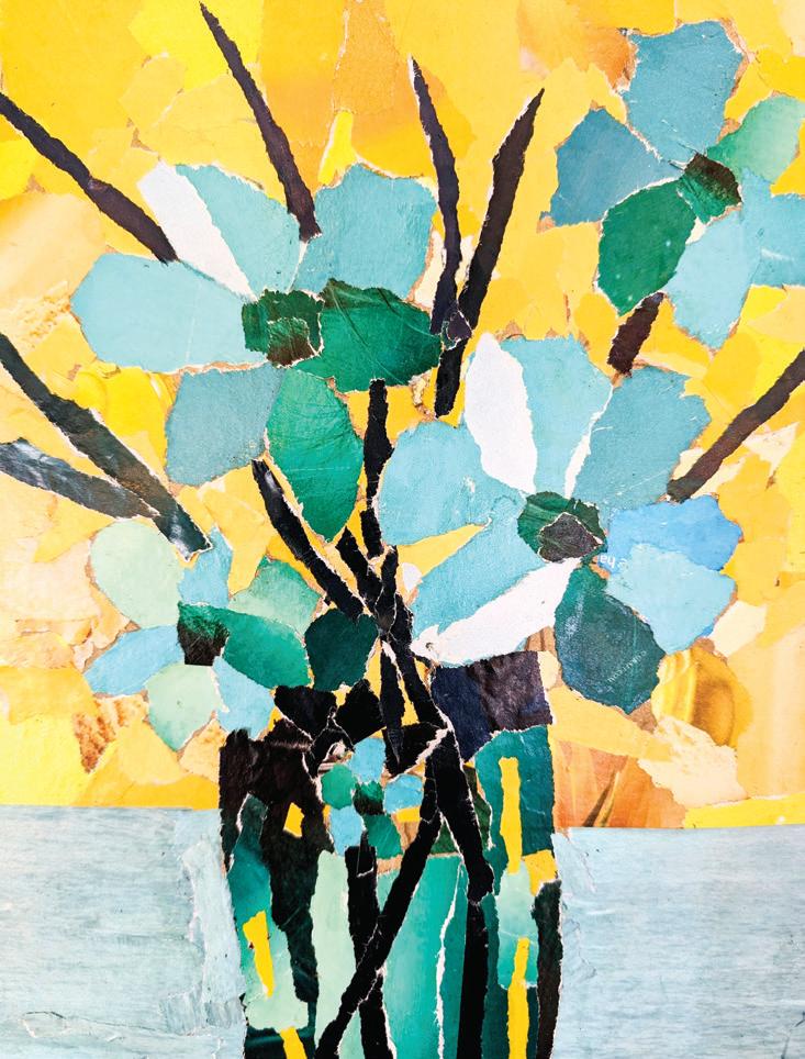 Collect colour magazines. Choose a colour scheme for your collage. For this picture I looked for a variety of yellows, greens, blues, black/ white. Separate your colours into different piles. Look for a variety of tones of the same colour. Before you start practise tearing (no cutting). If you rip towards you, you will get a different edge than if you rip away from you. There is no right or wrong way just a matter of what edge you prefer. Sketch your flowers and vase. Rip petal shapes and glue down until you get a flower shape. Then place a small, ripped circle in the middle and then do the rest. Then rip different shades of yellow for your background and dark green strips for your stalks. Now do the vase in different colours. Lastly do the foreground in light blue or grey.