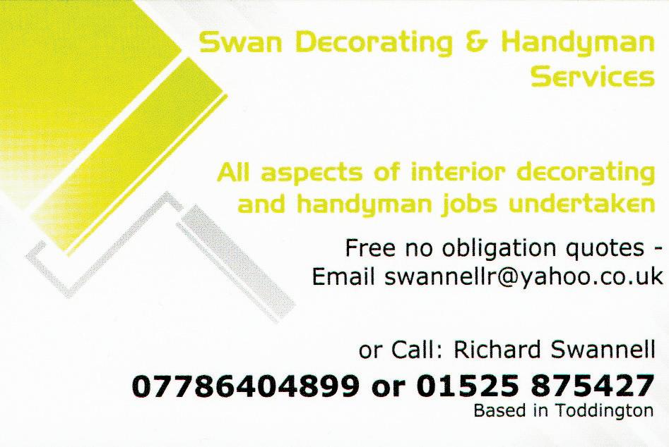 13 www.the vine directory.co.uk Dunstable Town Cricket Club NEED A VENUE YOUR EVENT - OUR PRIORITY •Corporate Events •Birthdays •Awards •Weddings 07710 907416 DUNSTABLETOWNCC@GMAIL.COM LANCOT PARK, DUNSTABLE RD, TOTTERNHOE LU6 1QP ) * •Training •Funerals •Launches •Year End •Christenings HOME VISITING CHIROPODIST / PODIATRIST Please call 07746472781 Julia Reading BSc (Hons) HCPC Registered Podiatrist For all your foot health needs Swan Decorating & Handyman Services All aspects of interior decorating undertaken