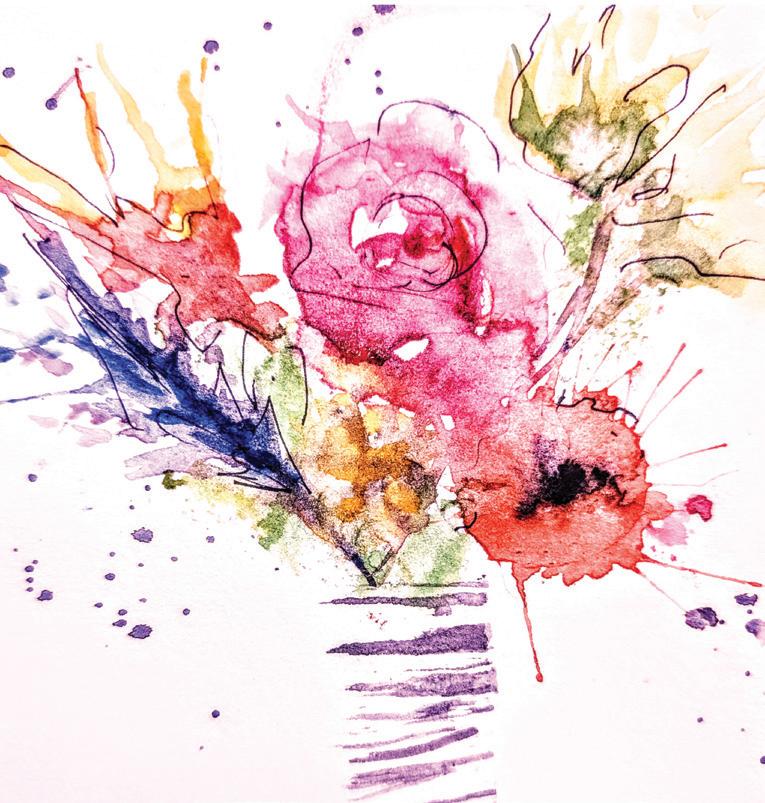 Choose 3 colours that you like to create abstract flowers. Begin at the middle/top end of your page and load your brush with clean water to make a circular shape (flower head size). Drop one blob of water colour into the wet shape and blow the paint with a straw. Move your paper around to blow in different directions. Repeat a few times in different colours. To create a leaf, use clean water to create very wet lines and drop green colours into it and blow with your straw. Also paint spiral clear water shapes onto your paper and dab colours into them and watch the paint move around. Dip the edge of your credit card into paint and print lines onto the paper to create a vase shape. Leave it to dry. Then draw over the top of your colours in black pen to create flower and leaf shapes. Lastly, splatter a colour over an area of your dry painting and frame it. Ta dah!