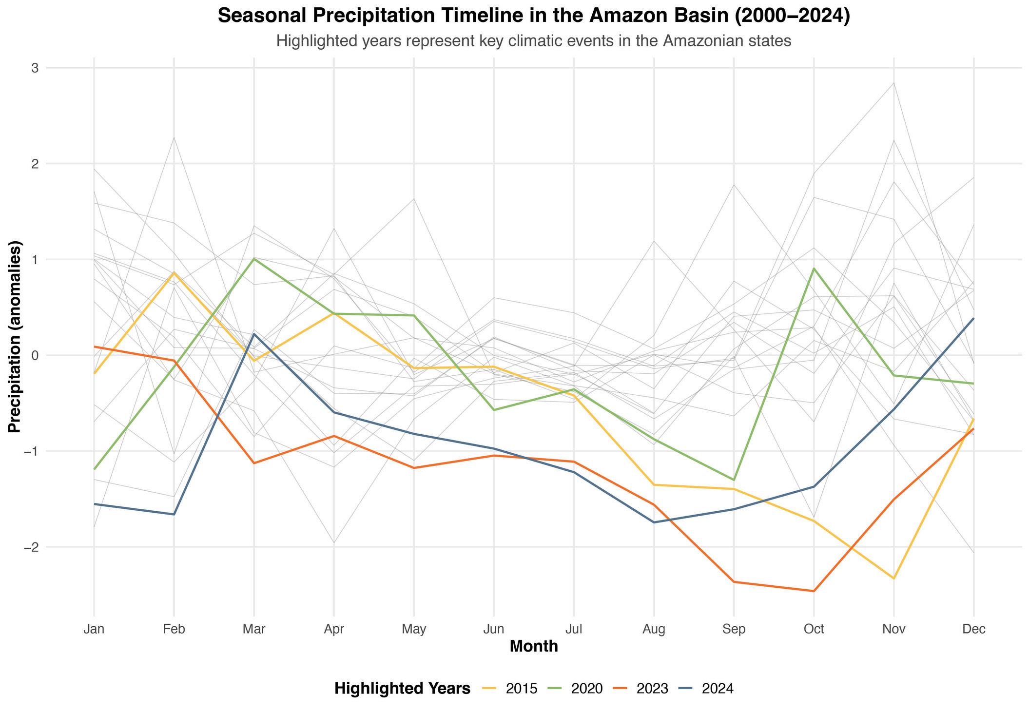 Figure 7: Interannual monthly precipitation anomalies for the period 2005–2024 averaged over the Amazon Basin Monthly time series are provided for each year (grey lines), and for some selected years characterised by low precipitation anomalies (2015, yellow line; 2020, green line; 2023 red line and 2024, blue line).