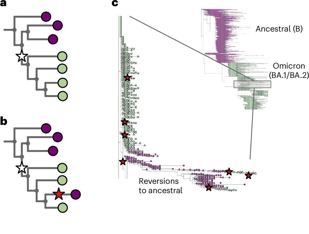 the global SARS-CoV-2 phylogeny hosted at taxonium. org (accessed 9 April 2024), zoomed in to show where Omicron branches from the ancestor. Leaves are colored by the genotype of genome position 22813 (codon 417) in the spike gene (again purple is ancestral). In the blow-up we see within the green (Omicron) clade, a striking spray of purple that does not sit cleanly in any subclade. Patterns like this, caused by systematic assembly errors, have been previously shown to occur in the SARS-CoV-2 phylogeny1. Such errors can have a considerable effect on our inferences about the underlying biology—in this case, K417N is a mutation that affects antibody escape7 and systematic errors like this can lead to misinterpretation. However, although one can use a reversion count as a metric of whether we suspect there are assembly problems, reversions are not always errors. For example, SARSCoV-2 has a C-to-T mutation bias (strictly a C-to-U, as it is an RNA virus, but we convert to DNA space for phylogenetics), so if you have a T to C mutation on a phylogenetic branch leading to a large clade, you may expect to see multiple reversions back to T in that clade.