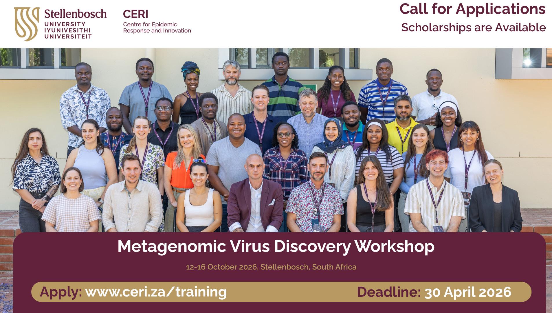 The Centre for Epidemic Response and Innovation (CERI) invites applications for a five-day intensive Training in Metagenomic Virus Discovery. This hands-on workshop will be led by global experts, offering participants practical skills and strategies in virus discovery—from project design to advanced analysis.