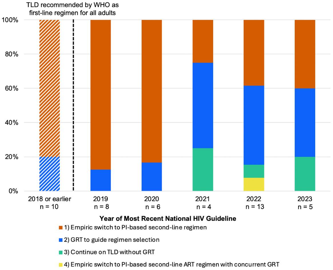 Evolution of recommended approaches to management of virologic failure on firstline TLD by year of most recent published national HIV guidelines. Abbreviations: ART, antiretroviral therapy; GRT, genotypic resistance testing; HIV, human immunodeficiency virus; PI, protease inhibitor; TLD, tenofovir disoproxil fumarate + lamivudine + dolutegravir