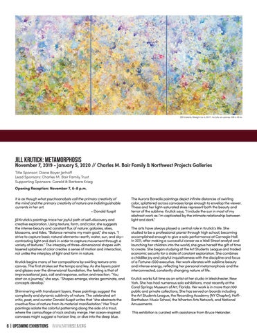 November 7, 2019 - January 5, 2020 // Charles M. Bair Family & Northwest Projects Galleries Title Sponsor: Diane Boyer Jerhoff Lead Sponsors: Charles M. Bair Family Trust Supporting Sponsors: Gareld & Barbara Krieg Opening Reception: November 7, 6-8 p.m. It is as though what psychoanalysts call the primary creativity of the mind and the primary creativity of nature are indistinguishable currents in her art. – Donald Kuspit Jill Krutick’s paintings trace her joyful path of self-discovery and creative exploration. Using texture, form, and color, she suggests the intense beauty and constant flux of nature: galaxies, skies, blossoms, and tides. “Balance remains my main goal,” she says. “I strive to capture basic natural elements—earth, water, sun, and sky— contrasting light and dark in order to capture movement through a variety of textures.” The interplay of three-dimensional shapes with layered splashes of color creates a sense of motion and interaction, not unlike the interplay of light and form in nature. Krutick begins many of her compositions by swirling texture onto canvas. The first strokes set the tempo and key. As she layers paint and glazes over the dimensional foundation, the feeling is that of improvisational jazz, call and response, action and reaction. “You start on a journey,” she says. “Shapes emerge, stories germinate, and concepts develop.” Shimmering with translucent layers, these paintings suggest the complexity and dynamic sublimity of nature. The celebrated art critic, poet, and curator Donald Kuspit writes that “she abstracts the creative flow of nature from its material manifestation.” Her Trout paintings isolate the colorful patterning along the side of a trout, where the camouflage of rock and sky merge. Her ocean-inspired canvases might suggest a horizon line, or dive into the deep blue.