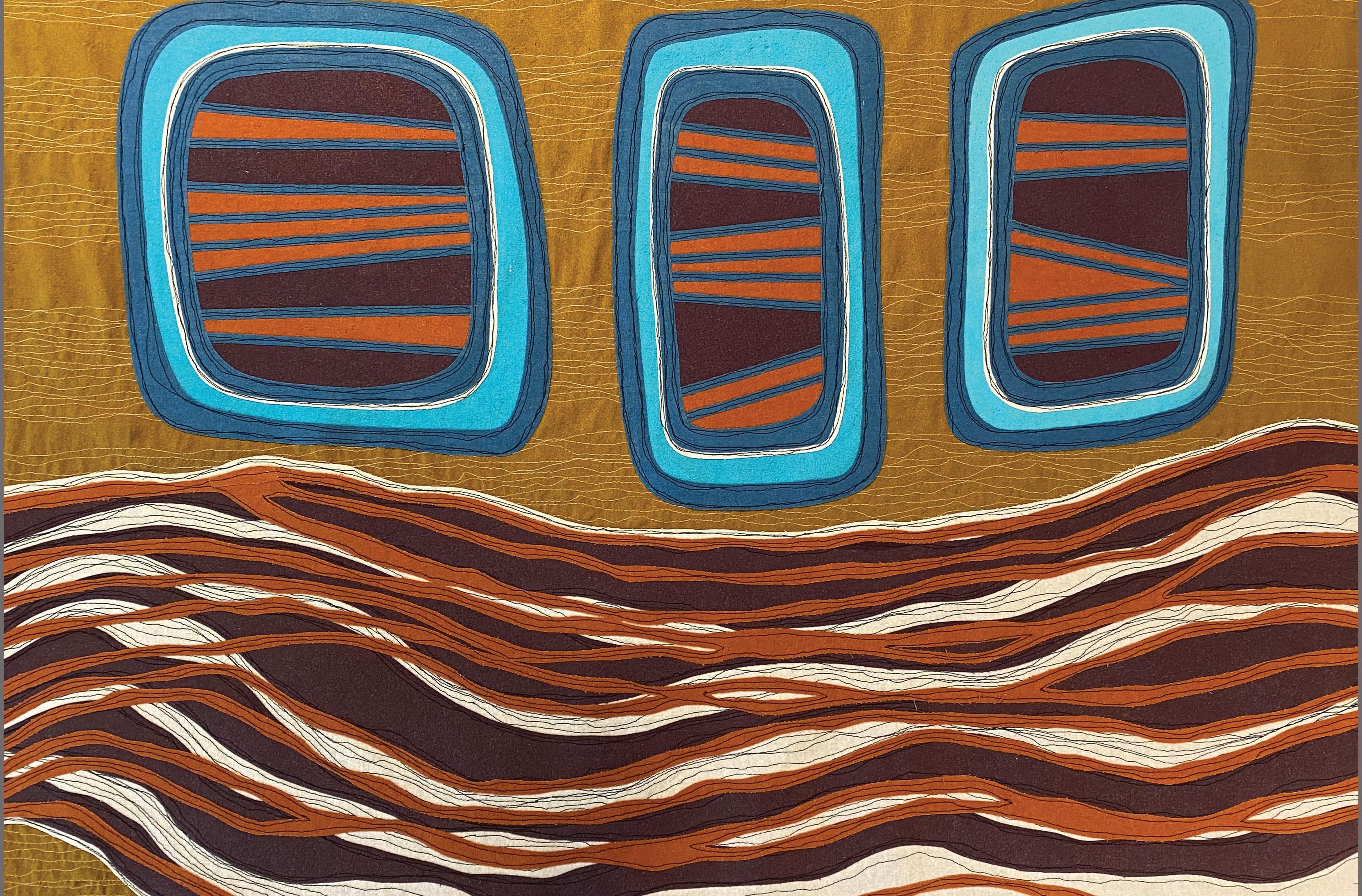 Monica Thompson, Shiny in the Breeze, 2024. Textile collage, 24 x 36 inches.
