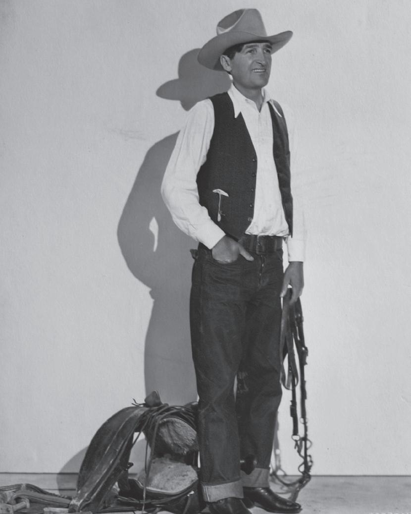 Otto Dyar, Will James with reins and saddle, c. 1933, Photographic print, 9.5 x 7.75 inches. Gift of Virginia Snook.