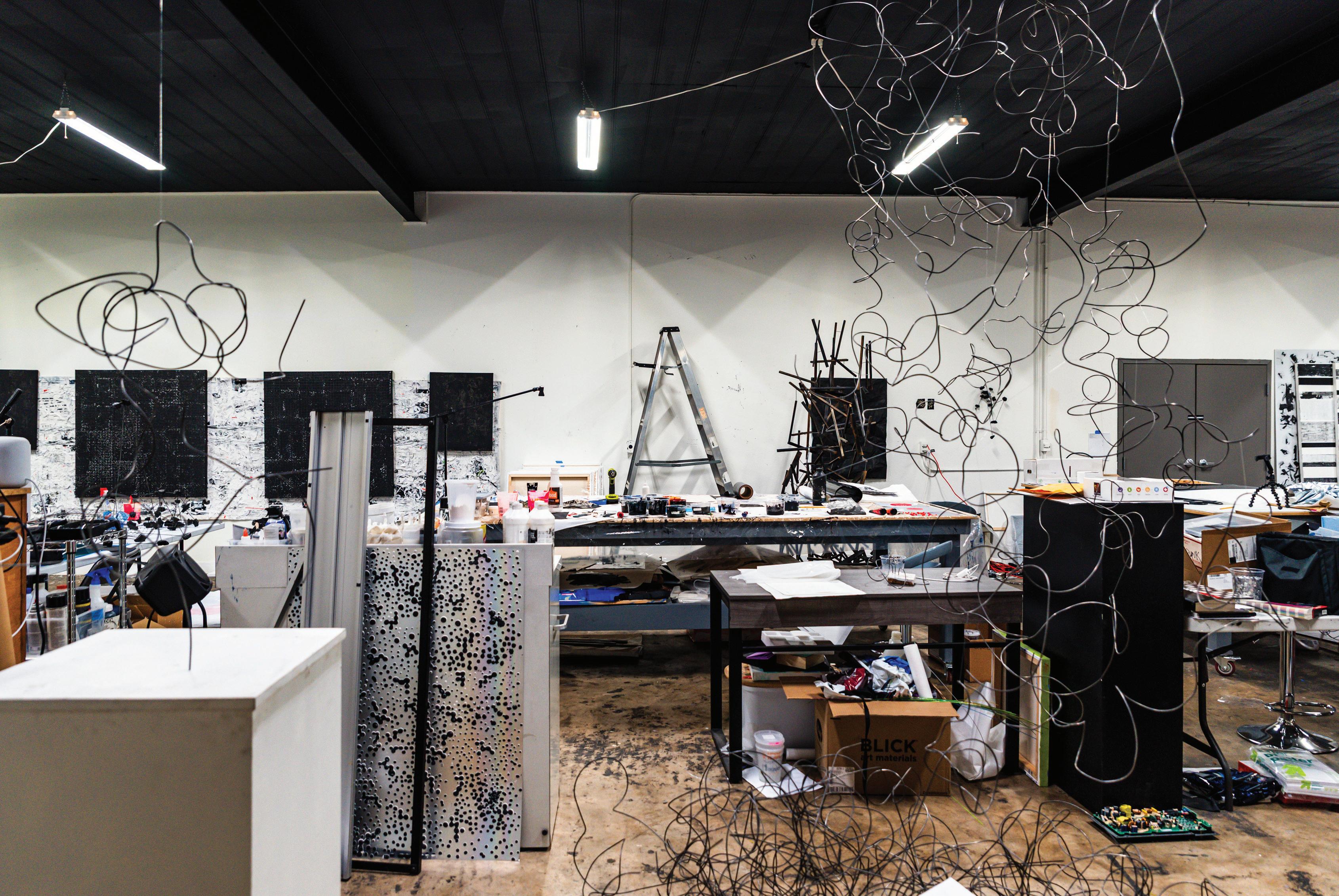 Lodge employs a system of randomness to artmaking through experimentation of material surface tension, indirect manipulation, and placement, or by allowing materials to dictate form and balance with their ability to bend, capture moving patterns of light, or fall to the ground. These methods invite each work to be a distinct and authentic expression of the idea and the material itself.