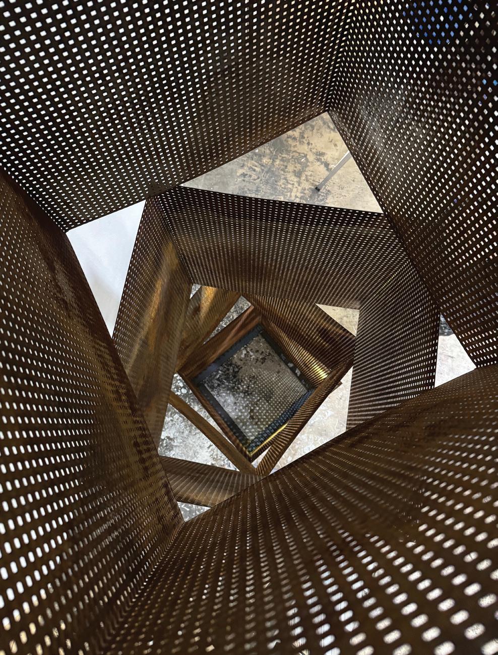 Jon Lodge, STRATA: Cumulus Undulatus Fractus Grid N° 1, 2025. Perforated COR-TEN carbon steel, rust clouds, laser welding, 24 x 24 x 148.75 inches, dimensions variable. Loan of the artist.