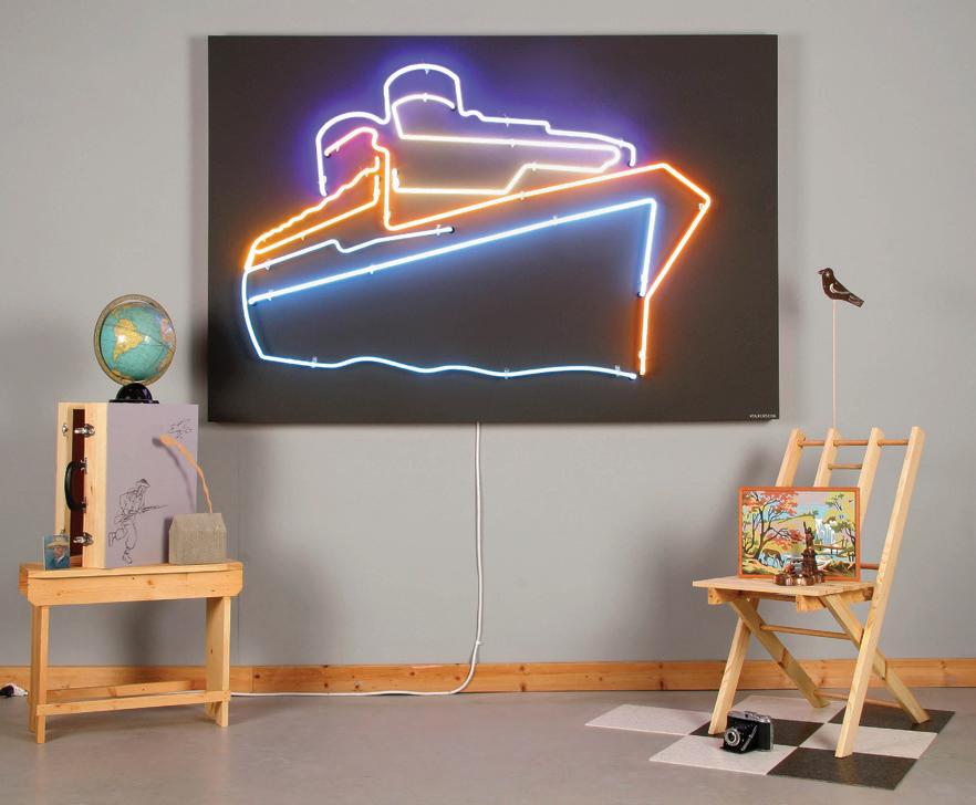 Willem Volkersz, Journey (To the Promised Land), 2008. Neon, wood, paint, tile, found objects, 82 x 104 x 46 inches.