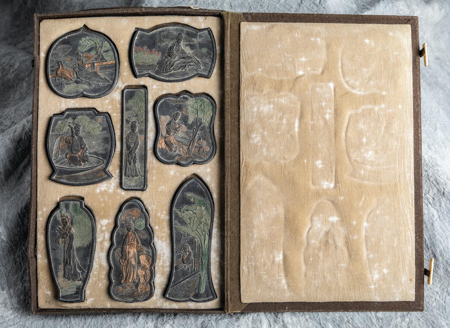 Left: Bhaisajyaguru, the Buddha of Healing, Seated Buddha. China, Qing dynasty, 18th – 19th c. Stone, 17.13 x 11.7 x 8.7 inches. Daryl S. Paulson Collection, Sorcha Matisse Photography. Right: Set of Eight Ink Cakes with Images of Elegant Women. China, Qing dynasty, 19th c. Ink, 11.46 x 7.48 x 0.79 (box closed). Daryl S. Paulson Collection, Sorcha Matisse Photography.