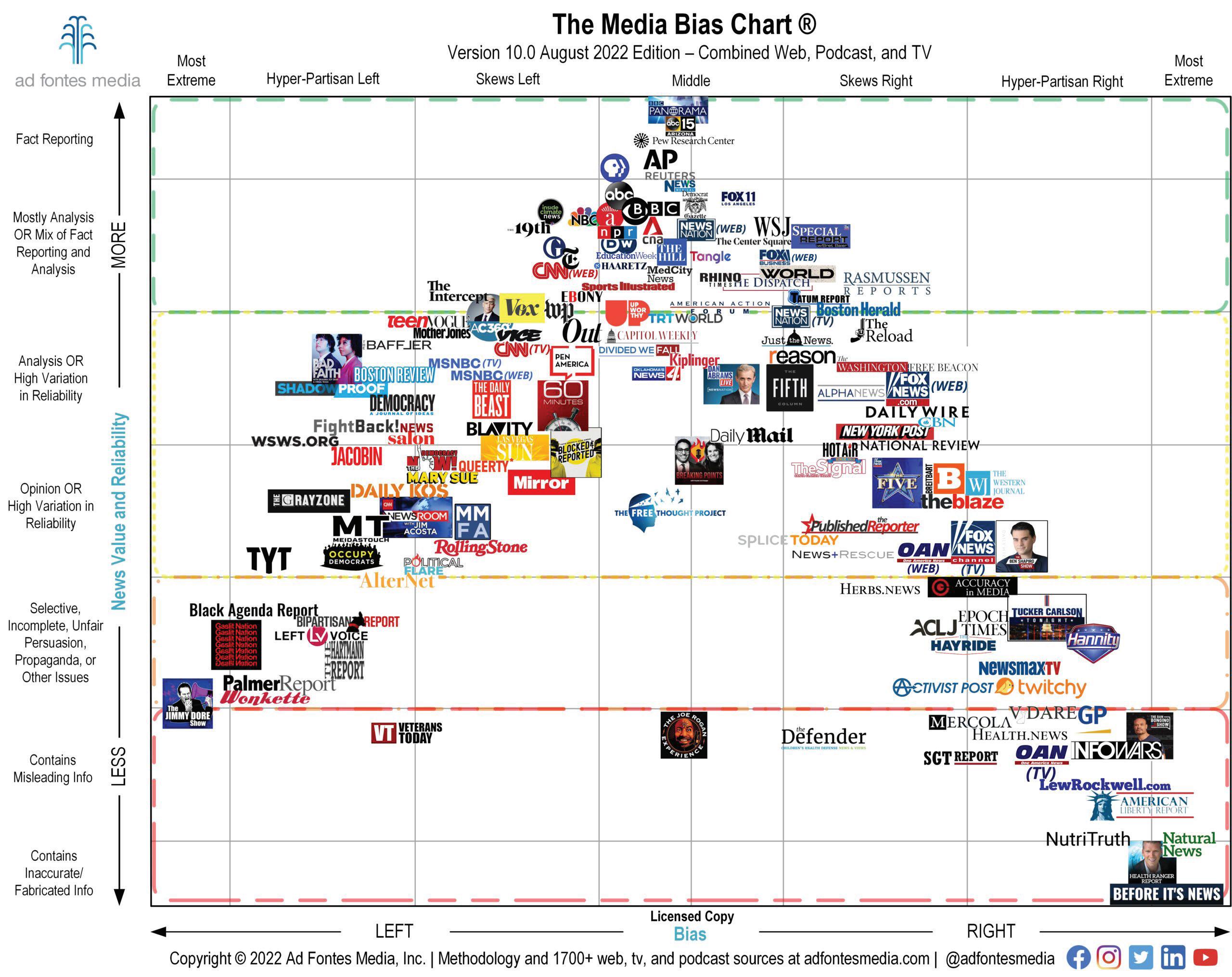 Mainstream media can influence voters. However, there are numerous news outlets that try to avoid political slant. Ad Fontes is a media bias research company that analyzes news content. Pew AP and Reuters are shown to be the most reliable and least biased of the news outlets. (Graphic courtesy of: Ad Fontes Media)