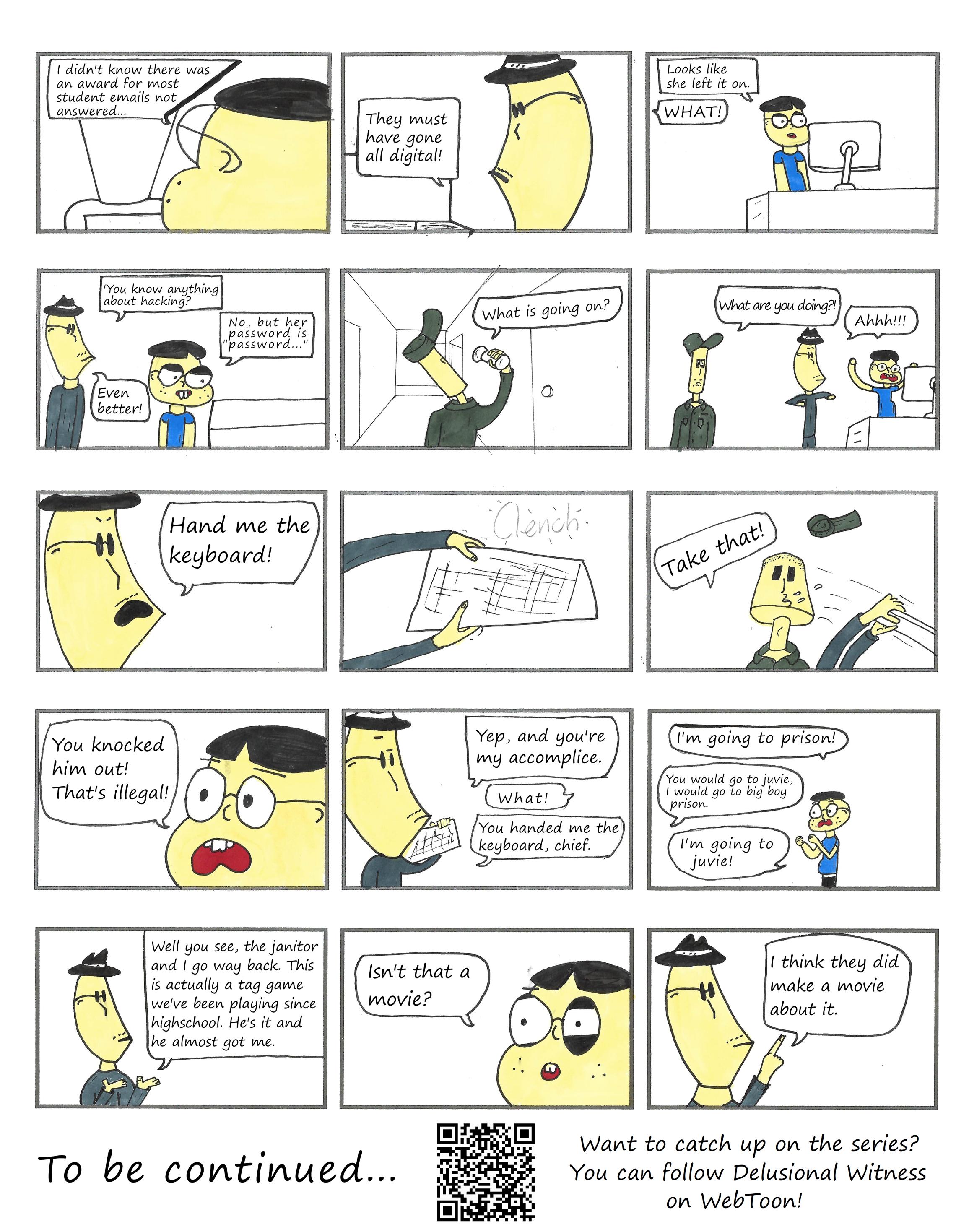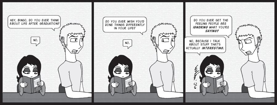 EM: Exactly! I got comments from people in classes when they recognized my name in class and matched it to my name on the comics. It was always a really good feeling to hear someone say they enjoyed it and looked forward to it each week.