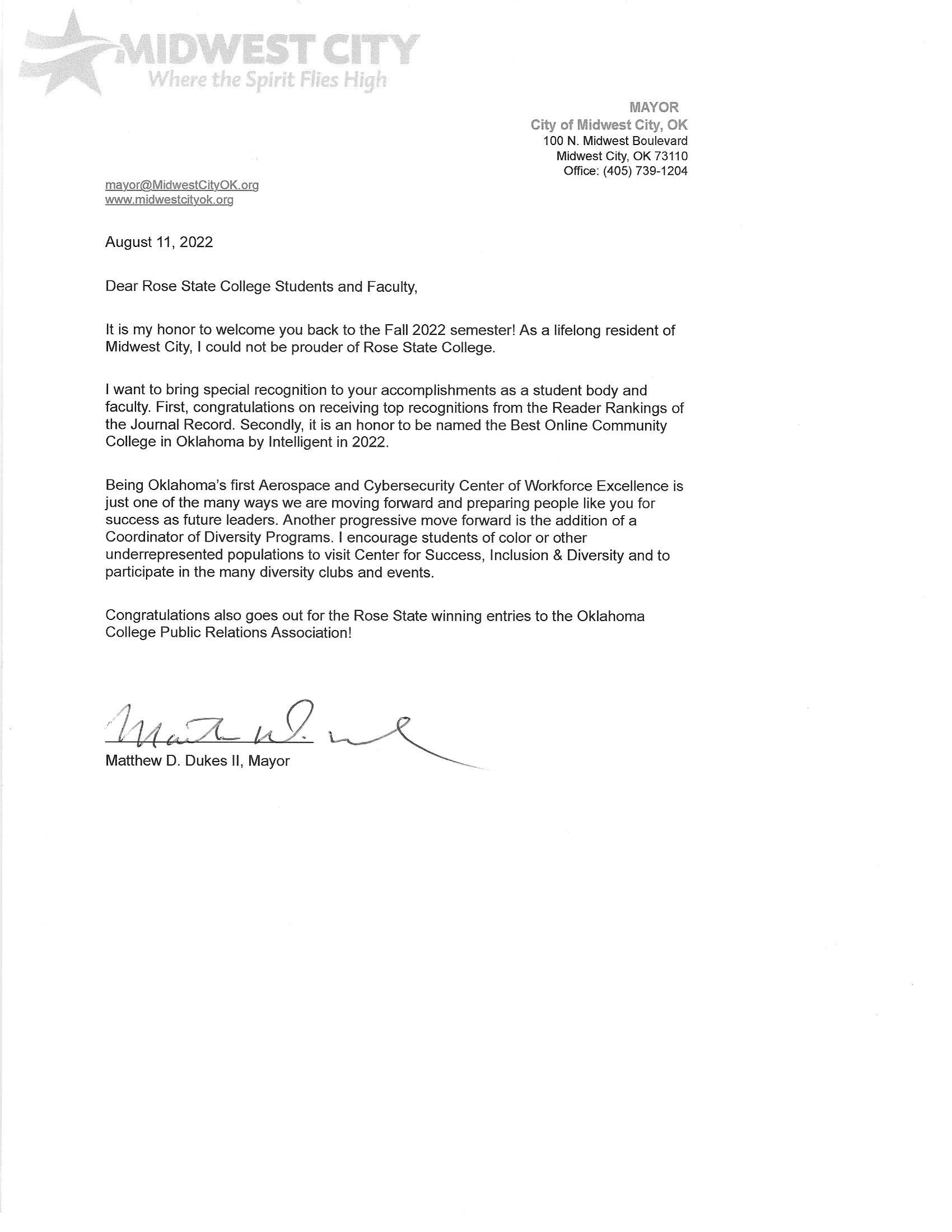 I hope you enjoy your experience at Rose State College while you are achieving your educational and professional goals. I encourage you to find a way to get involved on campus and take advantage of the wonderful opportunities Rose State has to offer.