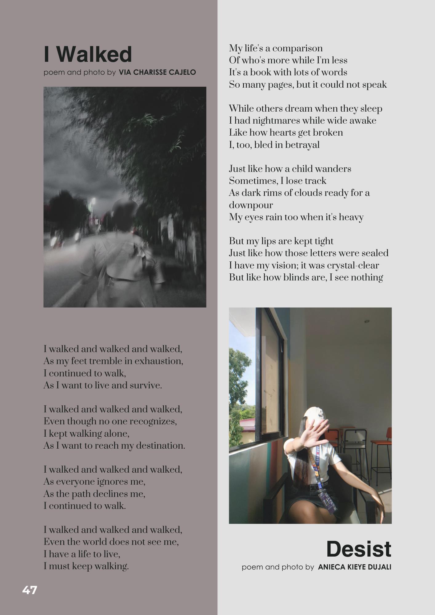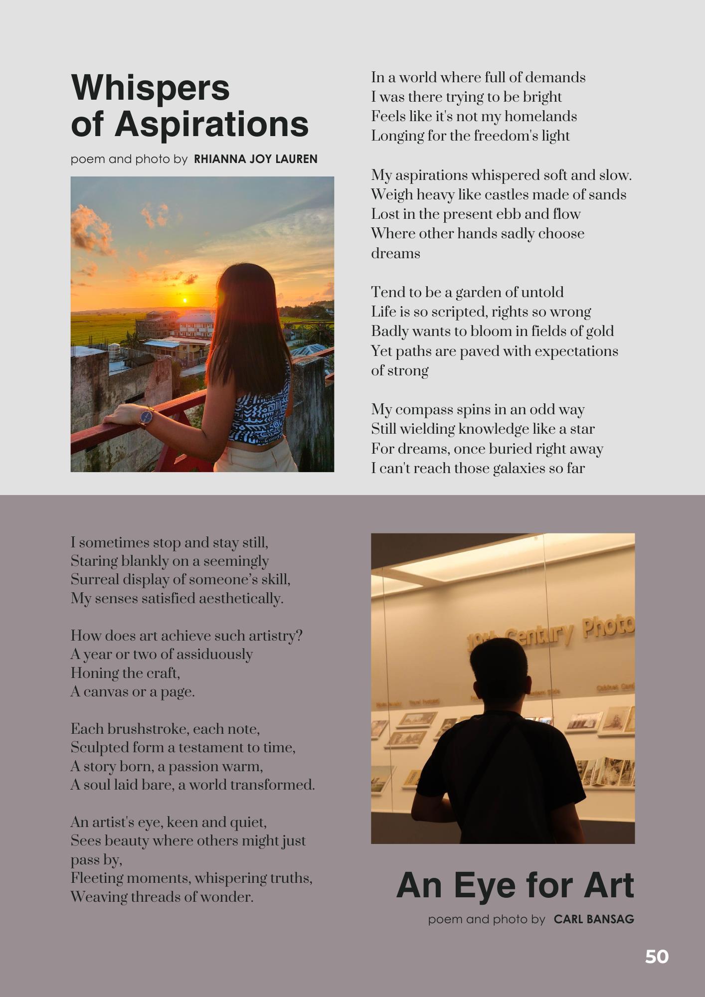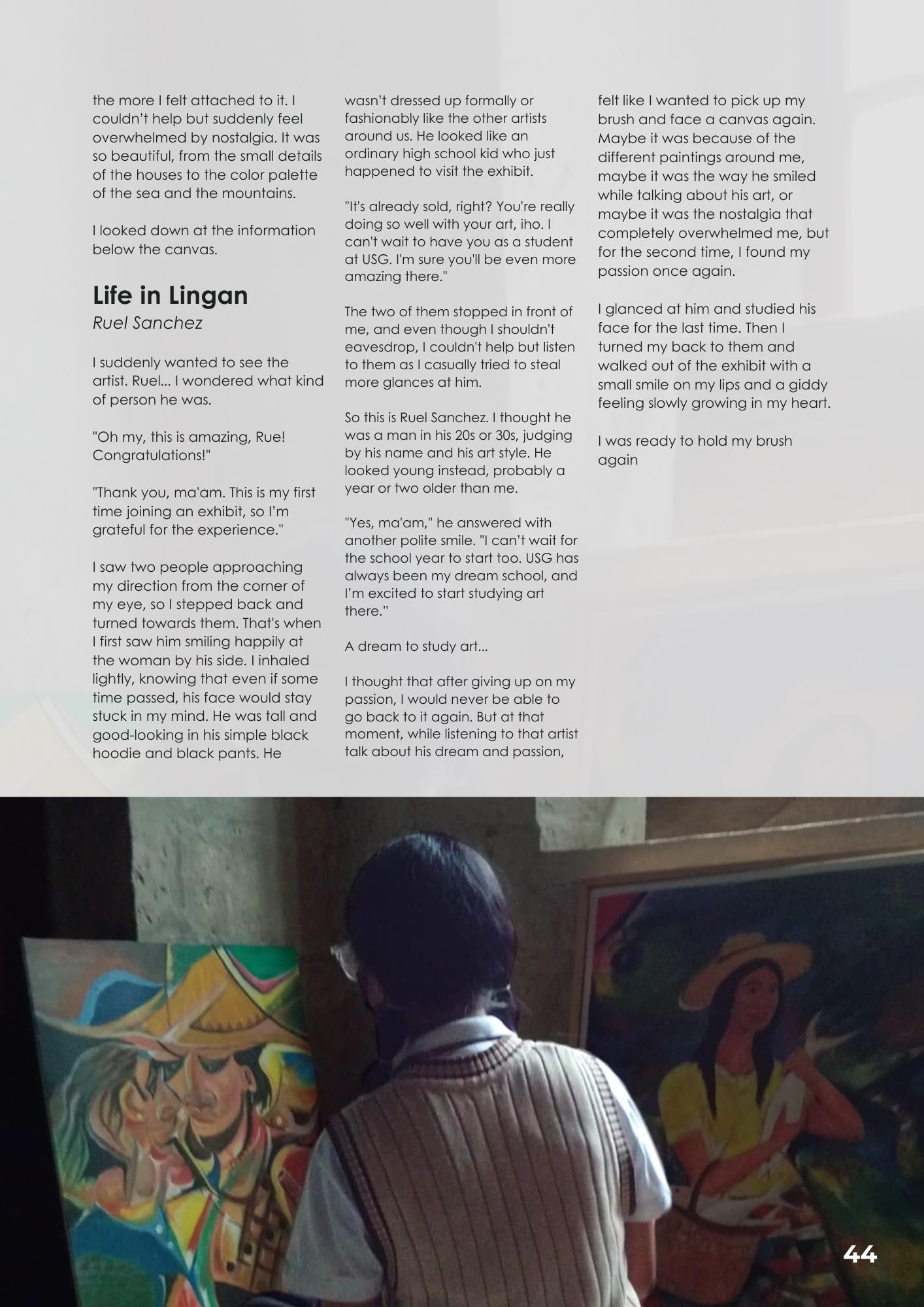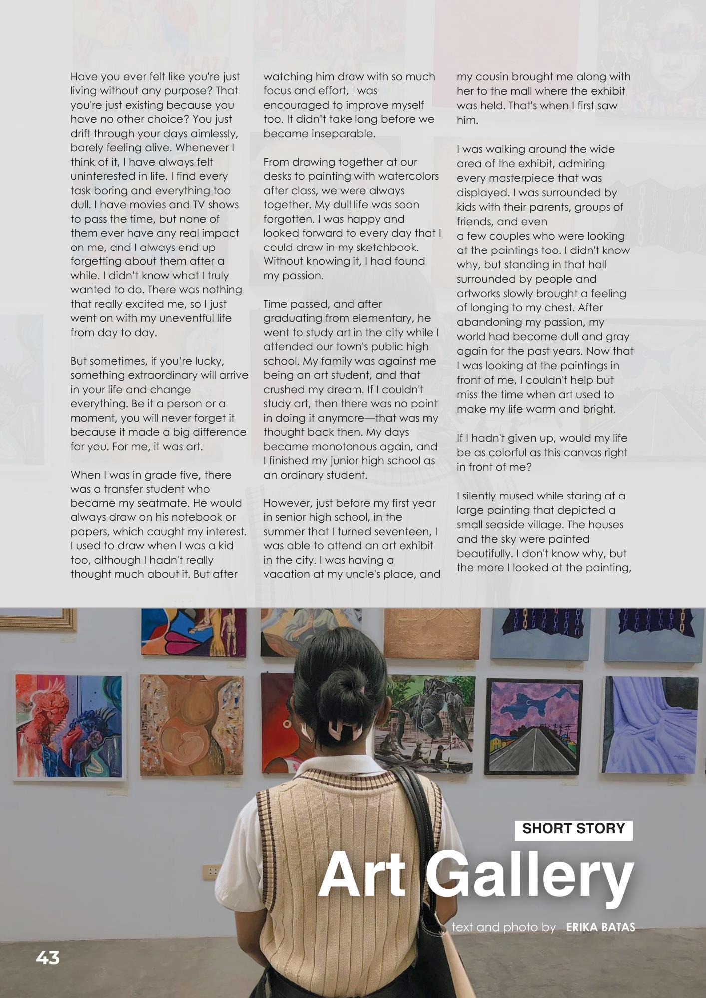 This part of the magazine includes the literary pieces of the publication such as short stories, poems, and movie and song reviews and recommendations.