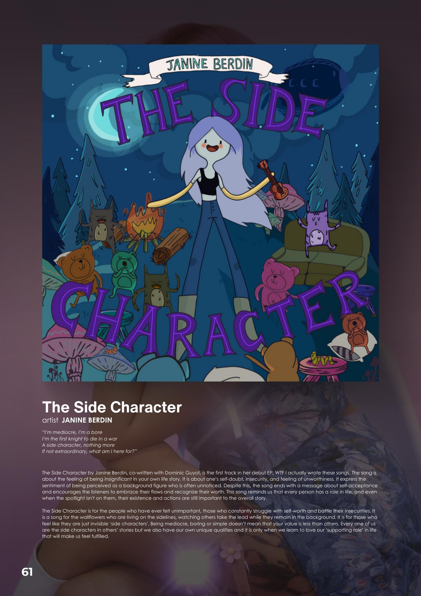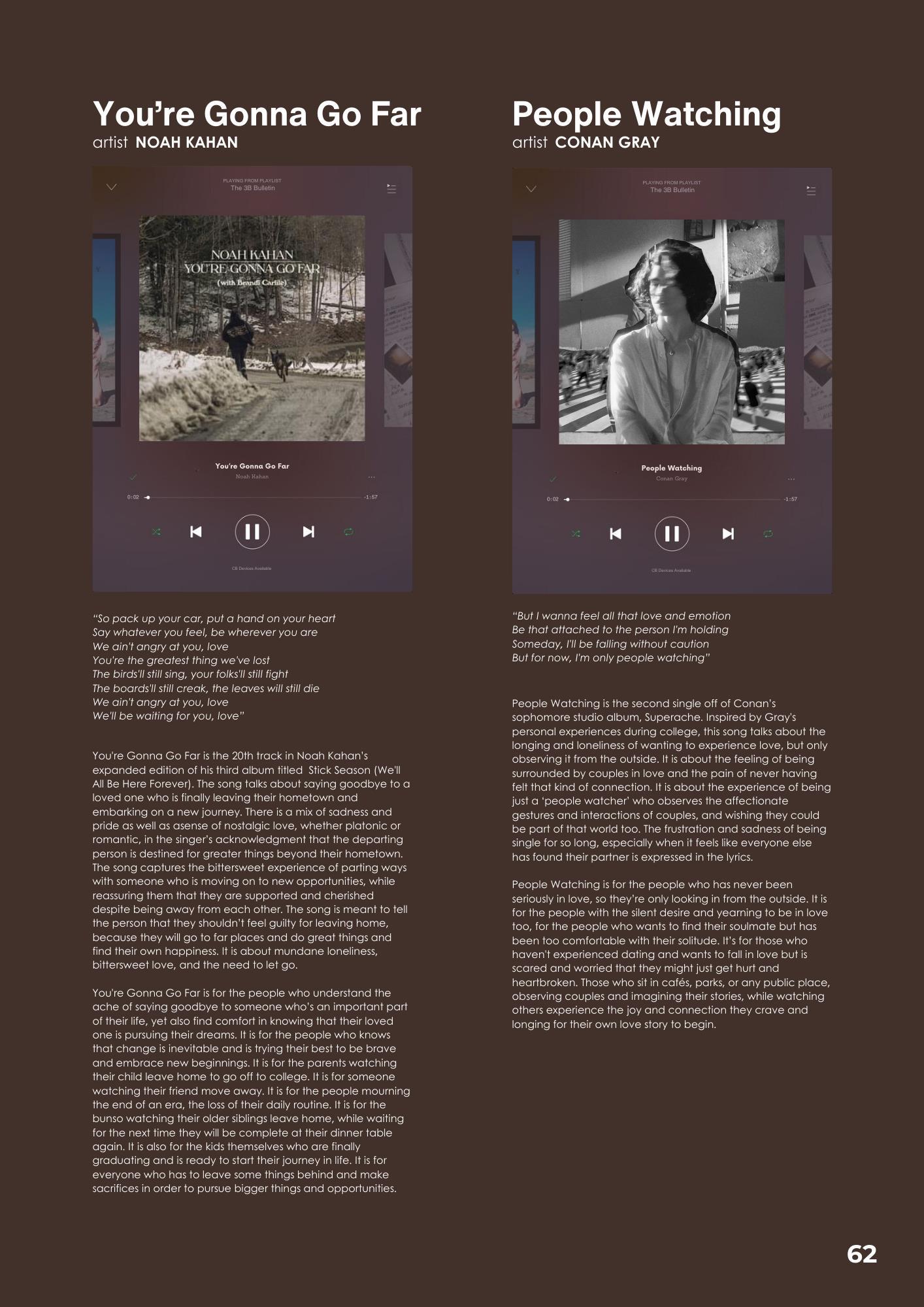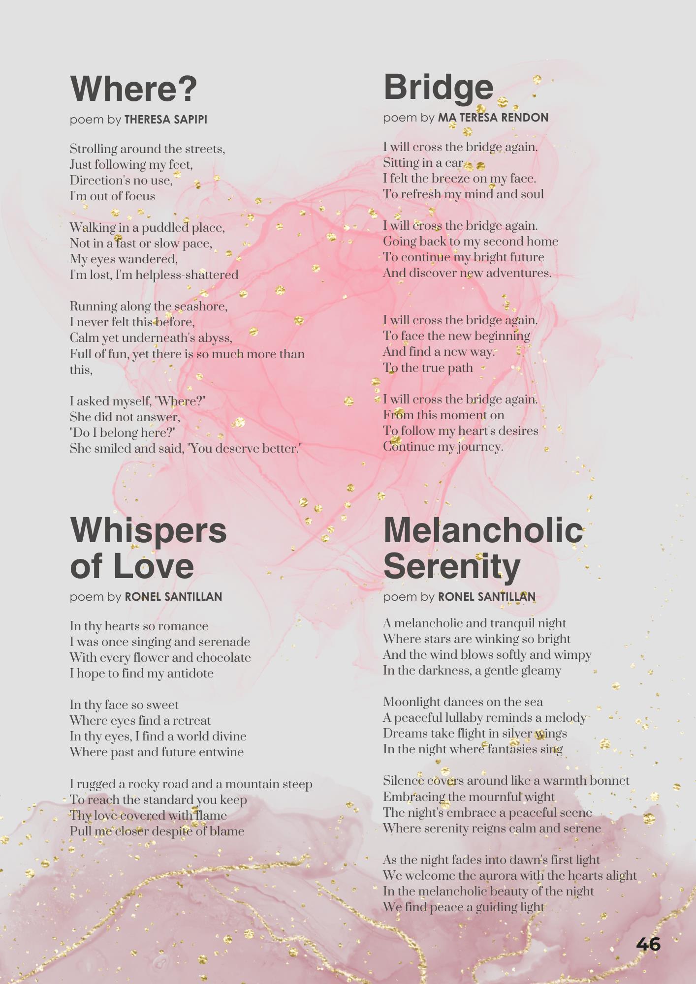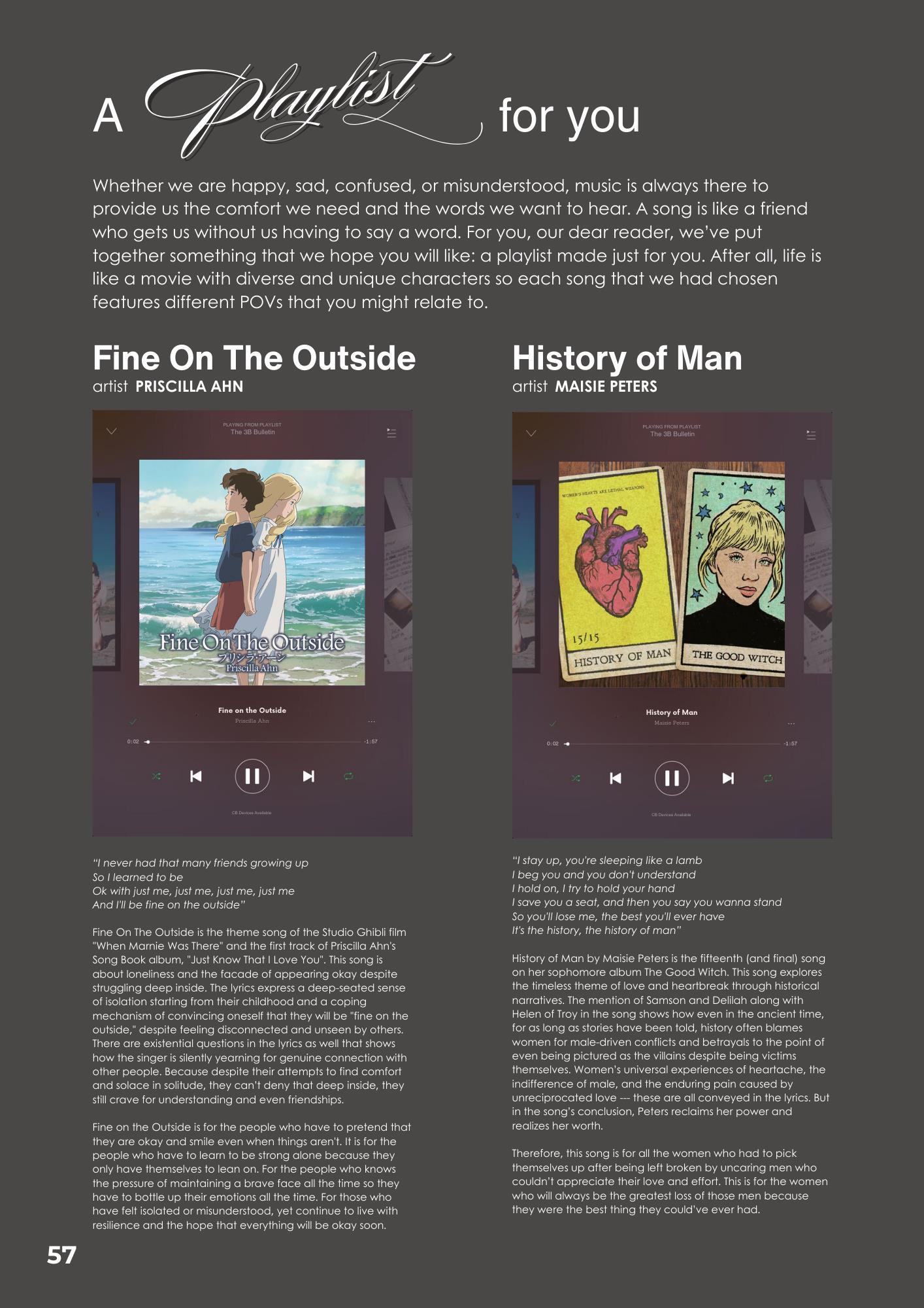 This part of the magazine includes the literary pieces of the publication such as short stories, poems, and movie and song reviews and recommendations.