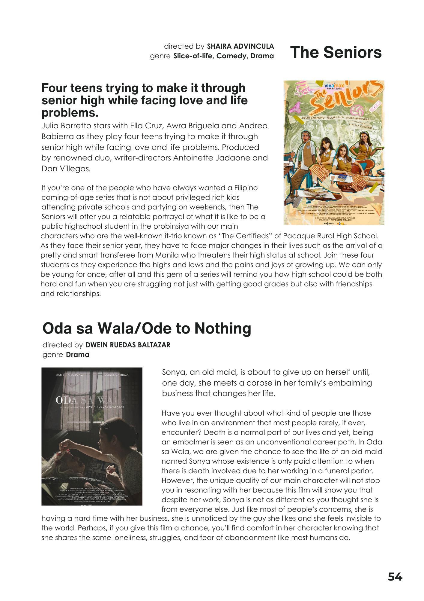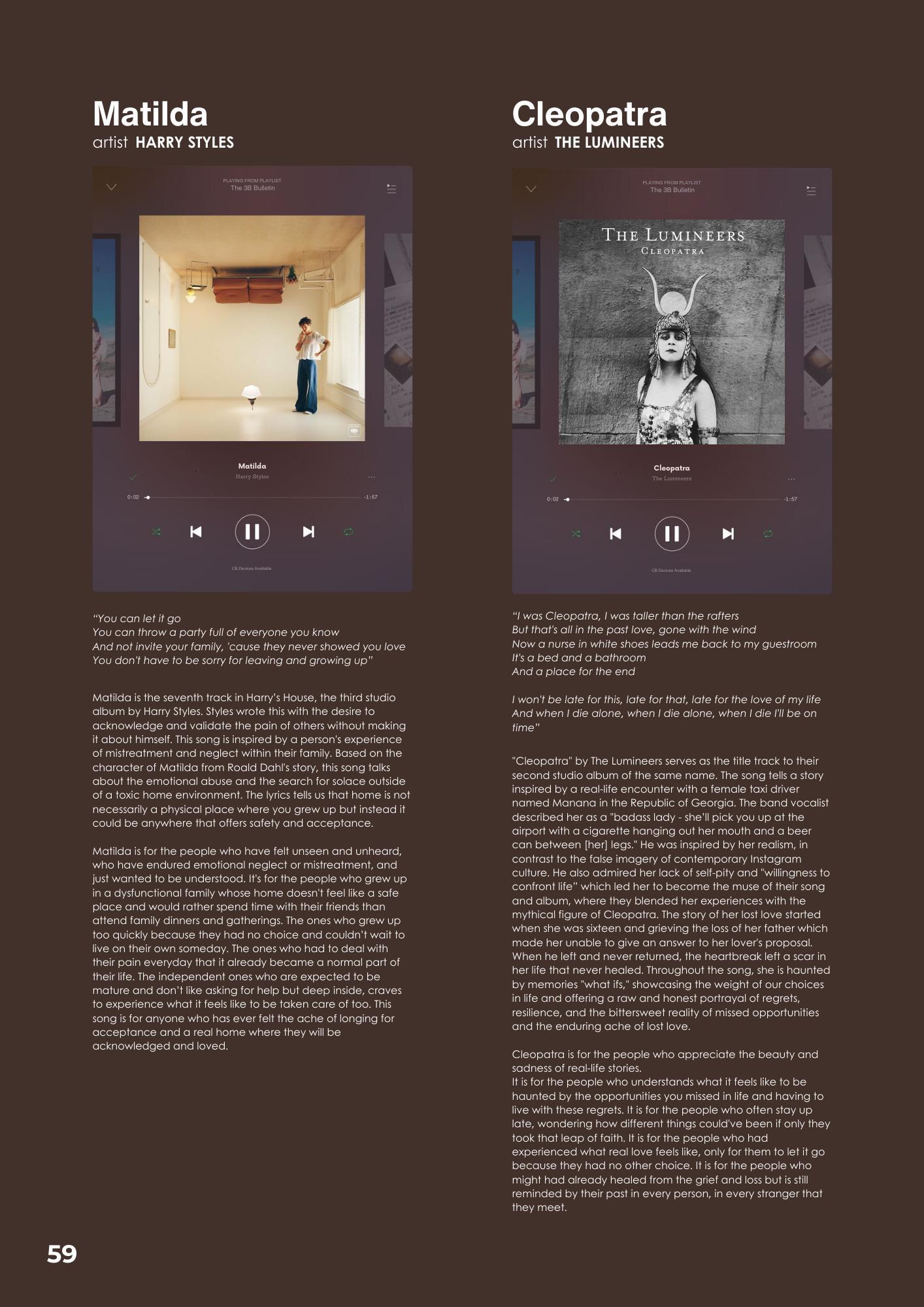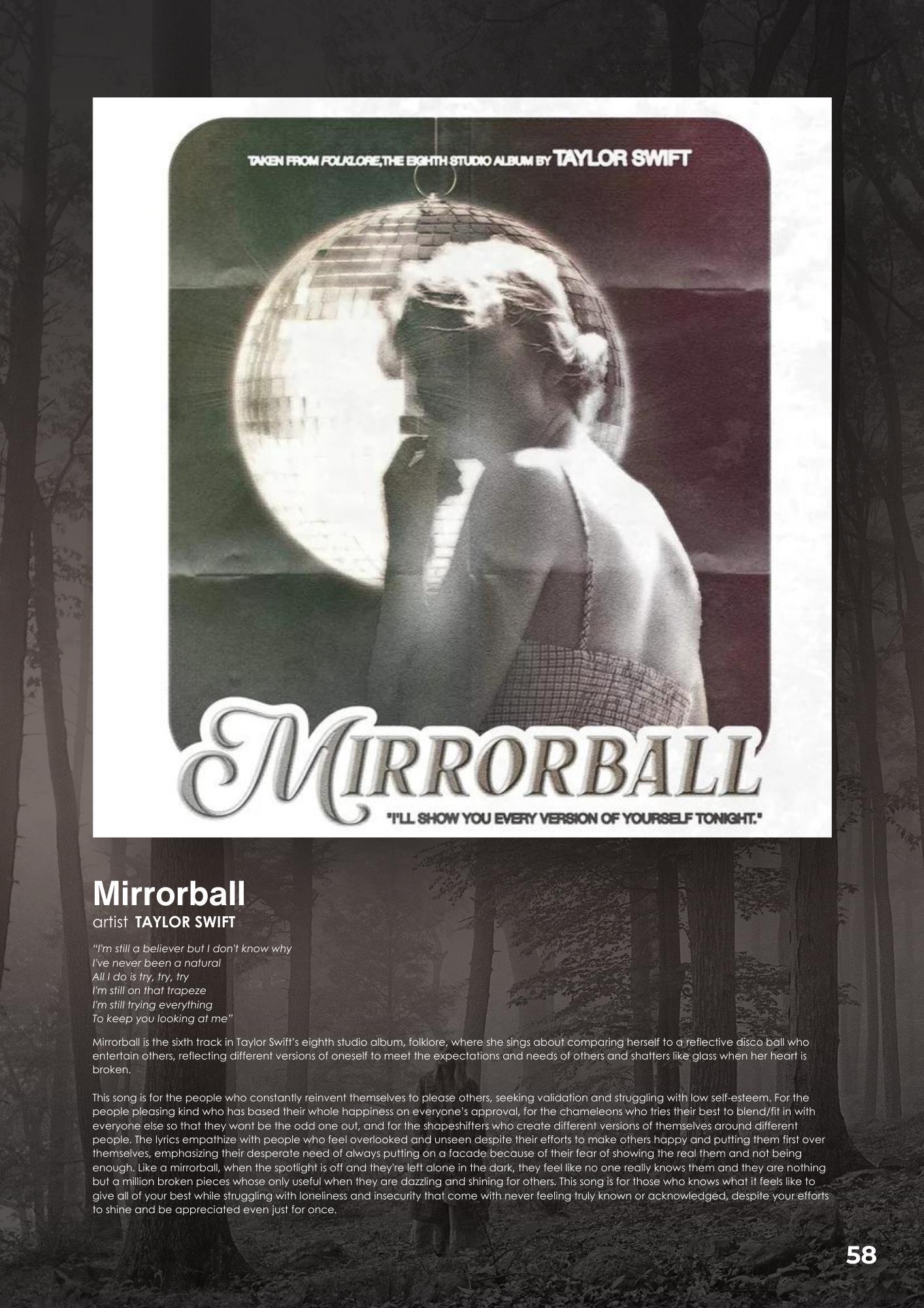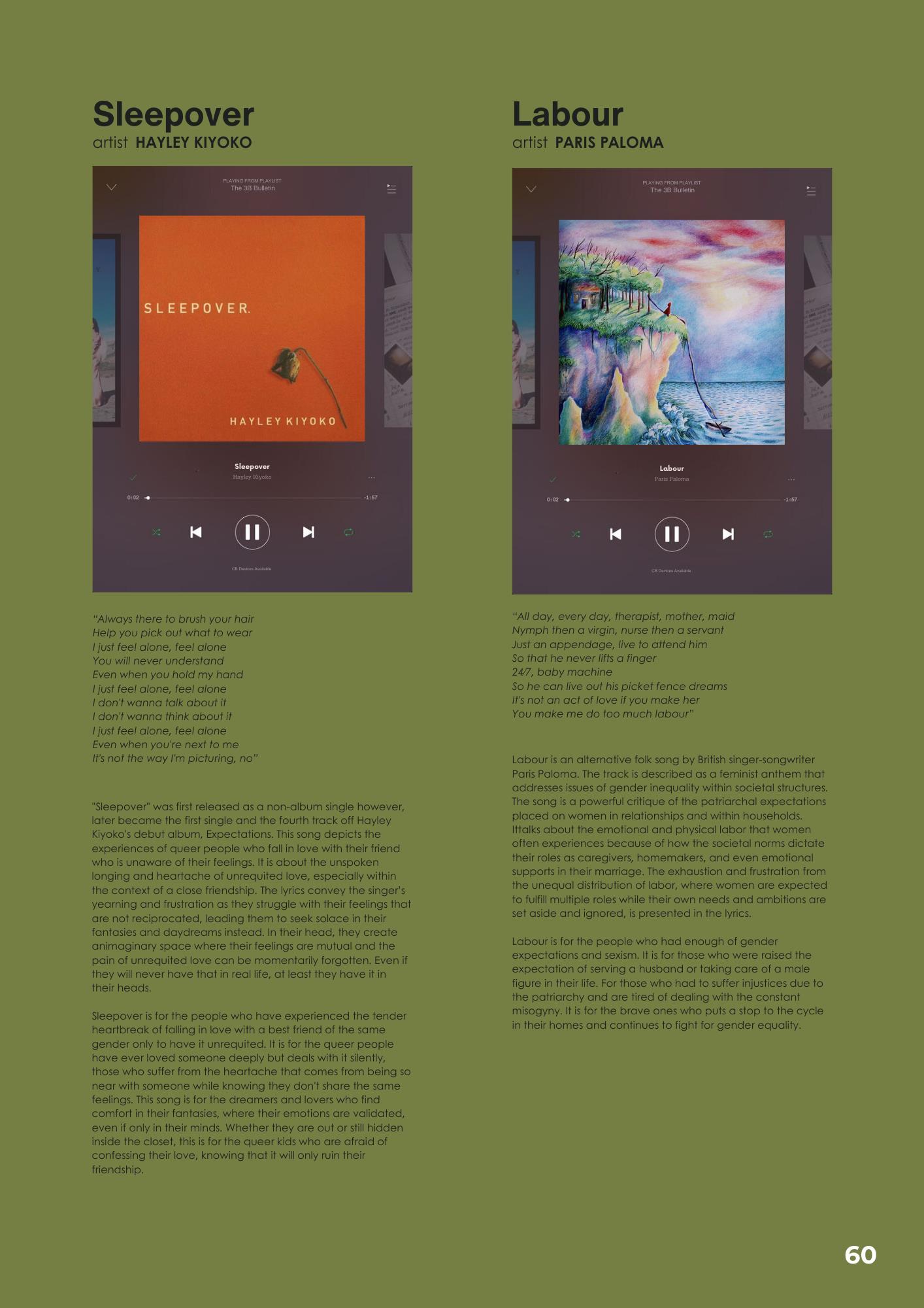 This part of the magazine includes the literary pieces of the publication such as short stories, poems, and movie and song reviews and recommendations.
