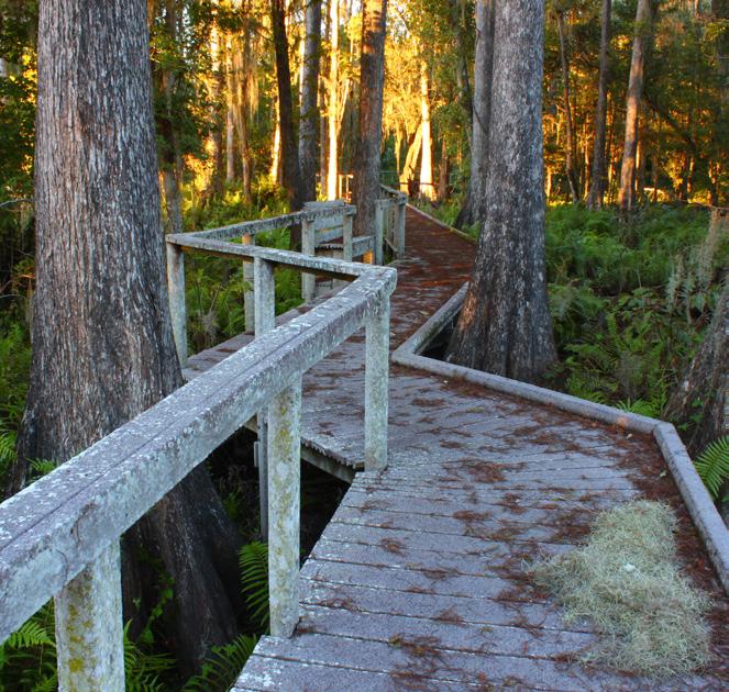visitors can drink from the spring. Next, head south to Lake Wales, which has an ‘old Florida” vibe and is one of the most scenic areas in the state. Known for its cypress trees, citrus groves and abundance of freshwater lakes, Lake Wales can’t be missed! Enjoy the history of these towns and don’t miss Highlands State Park for hiking, biking, birding and a variety of rare and native plants.