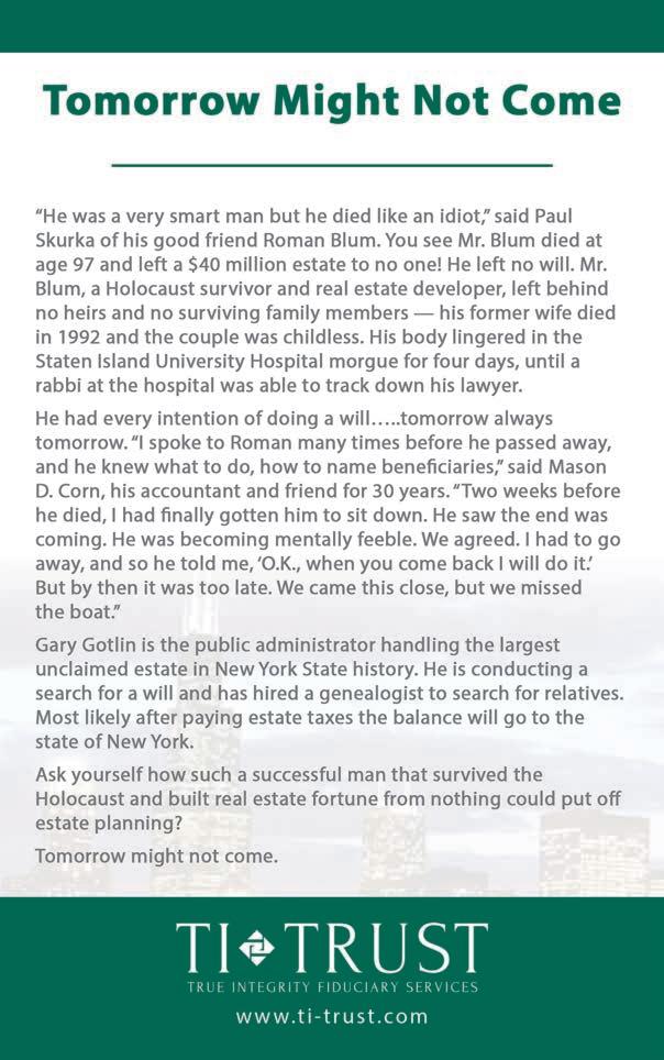 A well-executed estate plan can minimize gift, estate and generation skipping transfer taxes to ensure that the family receives as much of the deceased’s estate as possible. Everyone’s plan is different and requires the right team of professionals to implement. It is also important to update the plan regularly as personal circumstances, legislation, and tax laws change frequently.