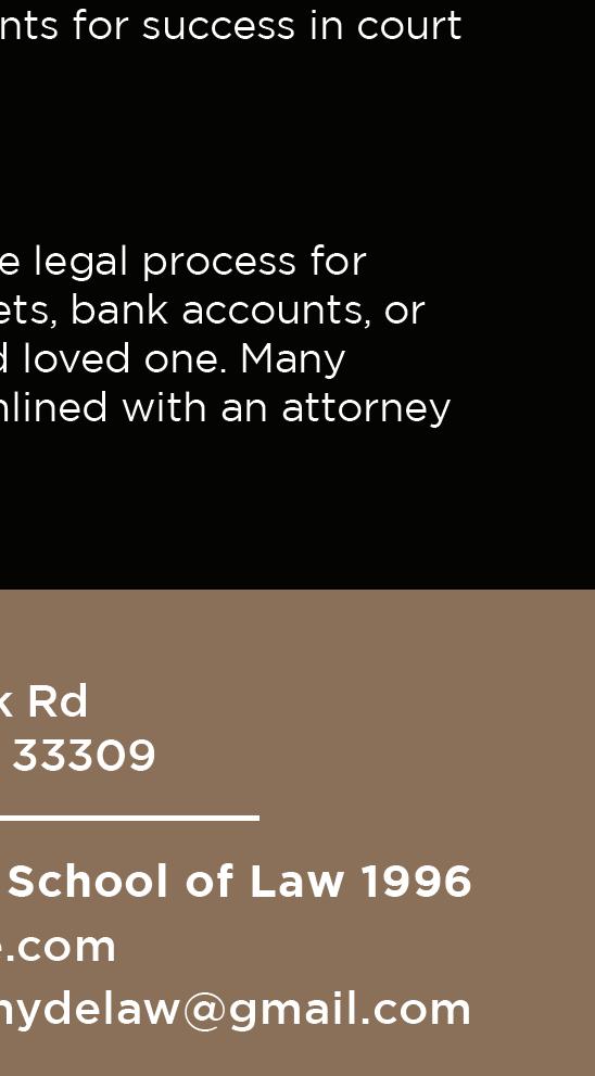 ACCOUNTANT Gamarra & Associates LLC 5 ATTORNEY Amster Law Firm ..................................................... 27 BOAT RENTALS Cruzan Yacht Charters .......................................... 13 CHIROPRACTOR North Broward Chirorpactic & Wellness 25 CRUISES Express Travel ...............................Front Inside Cover Proficient Travel IncNCL Cruise Lines.................................................. 5, 17 ESTATE PLANNING Menendez Law Firm 15 Andrea L. Jakob PA 1 FAMILY LAW Hyde Law Office ...........................Back Inside Cover HOME HEALTH CARE Caregivers of America ............. Front Cover, 2 0-21 INSURANCE Carolina Alcorta - Humana.................................... 11 LAW FIRM Amster Law Firm 27 MEDICAL SPA Florida Men’s Health Center.................Back Cover MEDICARE The Medicare Lady .................................................. 19 OPHTHALMOLOGIST Fort Lauderdale Eye Institute 13 PERSONAL INJURY Needle & Ellenberg ................................................... 9 Amster Law Firm ..................................................... 27 PROBATE Hyde Law Office Back Inside Cover Menendez Law Firm 15 REAL ESTATE Thomas Salzman - Keller Williams......................5 SUPPLEMENTS Sav-A-Lot Nutrition Centers ............................... 23 TAX LAW Menendez Law Firm 15 TAX PREPARATION Gamarra & Associates LLC 5 TRAVEL Express Travel ...............................Front Inside Cover Proficient Travel IncNCL Cruise Lines.................................................. 5, 17 VITAMINS Sav-A-Lot Nutrition Centers 23 WELLNESS CLINIC Florida Men’s Health Center Back Cover RECOMMENDED SERVICE DIRECTORY 40