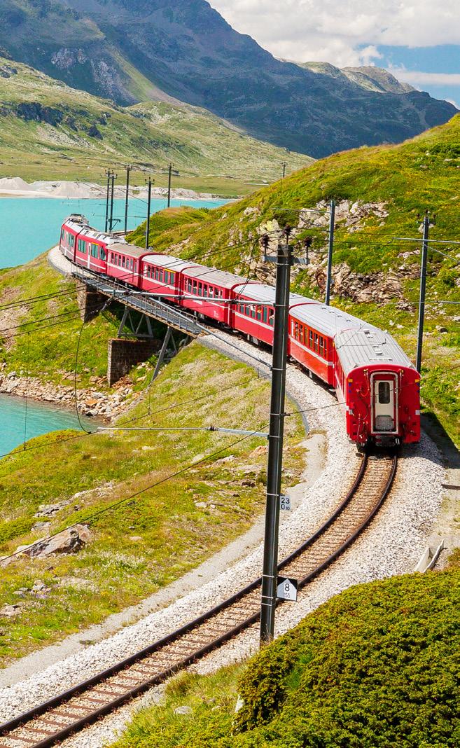 In Switzerland, be sure to check out the Bernina Express which is a 90 mile journey from Tirano in northern Italy to Chur in southeastern Switzerland. Highlights include unparalleled panoramic views of the steep peaks of the Swiss Alps, charming villages and shimmering lakes. With 55 tunnels through the mountains and numerous bridges and viaducts, the vistas are stunning. Chur is the oldest city in Switzerland and the old town is actually car-free. The train has earned UNESCO World Heritage Designation due to its architectural features and long history.