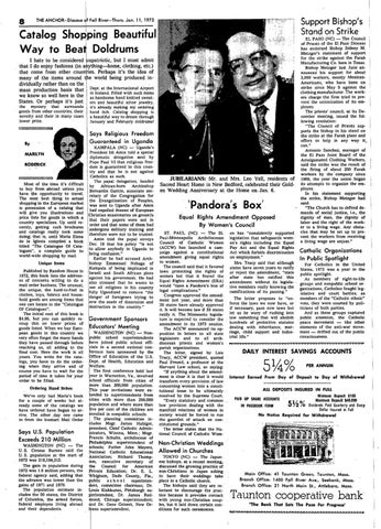 Support Bish~op/s Stand on Strike EL PASO (NC) - The Council of Priests of the El Paso Diocese has endorsed Bishop Sidney M. Metzger's statement of support for the strike against the Farah Manufacttiring Co. here in Texas. Bishop Metzger last June announced his support for about 3,000 workers, mostly MexicanAmericans, who have been on strike since May 9 against the clothing manufacturer. The workers charge the firm tried to prevent the unionization of its employes. The priests' council, at its December meeting, issued the following resolution: "The Council of Priests supports the bishop in his stand on the strike at the Farah plant and offers to help in any way it. can." Antonio Sanchez, manager of the El Paso Joint Board of the Amalgamated Clothing Workers, said the strike was the result of the firing of about 250 Farah workers by the - company since JUBILARIANS: Mr. and Mrs. Leo Yell, residents of 1969, the year the union. began Sacred Heart Home in New Bedford, celebrated their Gold- its attempts to organize the em· ployes. . en Wedding Anniversary at the Home on. Jan. 6. In his statement. supporting the strike, Bishop Metzger had said: "The Church has to defend demands of social justice, i.e., the dignity of man, the dignity of Equal Rights Amendment Opposed labor and the right of the workBy Women's Council er to a living wage. Any obstaST. PAUL (NC) - The St. en has "consistently supported cles that may be set up to prePaul-Minneapolis Archdiocesan legislation that safeguards worn- . vent the workers from receiving Council of Catholic Women en's rights including the Equal a living wage are unjust." (ACCW) has launched a cam· Pay Act and the Equal Rights paign against a constitutional Act which forbids discrimination Catholic Organizations amendment giving equal rights on employment." In Public Spotlight to women. Mrs. Tracy said that although For Catholics in the United The council said that it favored states have seven years to ratify States, 1972 was a year in the laws protecting the rights of or reject the. amendment; "state women but that it feared the after state 'has ratified this public spotlight. . As members of right-to-life . h Equal RIg ts Amendment (ERA) amendment without its legisla- . groups and nonpublic school. orwou Id " open a Pan dora ' s box 0 f tive members really knowing the ganizations, Catholics fought leg· legal complications." ramifications of its passing." Congress approved the amende, islative and court battles; as ment last year, and more than The letter proposes to "en- members of the "Catholic ethnic" 20 states have already approved force the laws we now have, or' vote, they were courted by poliit. It will become law if 39 states if necessary, pass new laws but· ticians of both parties. ratify it. The Minnesota legisla- let us be wary of rushing into And as these groups captured ture is expected to consider the law something that will abolish public attention, the Catholic amendment in its 1973 session. hundreds of protective statutes peace movement - like other The ACCW announced its op- dealing with inheritance, mar- elements of the anti-war moveposition in letters to all state riage, child support and indus- ment - drifted out of the public legislators. and to all arch- trial life." consciousness. diocesan priests and women's •• ••••••••••••••••••••••••••••••••••••••• • ......... parish organizations. DAILY INTEREST SAViNGS ACCOUNTS The letter, signed by Lois Tracy; ACCW president, quoted Paul Freund, a professor at the PER ANNUM Harvard Law school, as sayipg: "If anything about the amendment is clear it is that it would Interest Earned From Day of Deposit to Day of Withdrawal transform every provision.of law concerning women into a constiALL DEPOSITS INSURED IN FULL tutional issue to be ultimately. resolved by the. Supreme Court. Minimum Deposit $100 PAID UP SHARE ACCOUNTS Maximum Deposit $40,000 . "Every statutory and common 1L law provision dealing with the 72 0 Dividends Paid Quarterly and Every IN PASSBOOK FORM Dollar Insured in Full manifold relations of women in society would be forced to run No Notice Required for Withdrawal the gauntlet of attack on constitutional grounds." The letter states that the National Council of Catholic Wom-