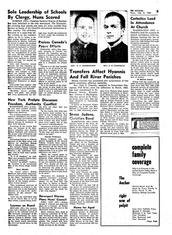 He was ordained March 17, cis Xavier since ,Tune, 1964, has been assigned to, Immaculate' 1956 by Bishop Connolly in the ,Cathedral. ~e is priests' choir Conception. A native of Norwood, Father director and a member of the Connolly, ,son of Mr. and Mrs. Diocesan Music Commission. Michael J. Connolly, was born Father Harrington, son of Ed Oct. 17, 1929. Following gradu- ward J. Harrington and the late Mrs, Esther F. (Yates) Harring ton, was born July 28, 1938 in New, Bedford. He is a graduate of Holy Family grammar and C[}u~o~~OatJ1 high schools and of Holy Cross College, Worcester. WASHINGTON (NC)-Chris tianity's bond to the Jews, its He completed his studies for spiritual renew.al and a re-em the priesthood at Catholic Uni phasis of the religious meaning versity and was ordained May of social action were stressed by 301 1964 by. Bishop Connolly. He speakers during the Week of has served as Cape Cod CYO Prayer for Christian Unity ob Director since June 4, 1964. served here at the National Shrine of the Immaculate Con ception. . Father Edward Flannery, for mer editor of the Providence Visitor and now a member of the Seton Hall University Insti tute for Judaeo - Christian Studies, spoke on the Second Vatican Council's Declaration on Non Christian Religions. ''The declaration," he said, "puts aright the mistakes and injustices of some 2,000 years' standing. In brief but crystal clear words a program is set up for bringing about the harmo nious relations that should exist between the two faiths (Chris tianity ard Juda~sm)." The early' Church, he noted, was a Jewish church, and the modern Church must now be taught this again 'and recognize "the bond that spirituality ties the people of the New Covenant to Abraham's stock." , "To do this," he said, -!!all of our media of communication in the Church must be employed the pulpit, tp.e press, the school room." Scholarly studies must be undertaken, texthooks must be examined, stereotypes and false images must' be identified and rooted out and social-political tensions must be explored, said Father, Flannery.