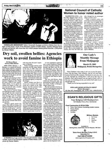 with more than 20 years' experiA local population explosion ence in Ethiopia. and a quasi-medieval farming ARBA GOSA, Ethiopia In Father Giuseppi said he could economy are partly to blame. Two Ethiopia, it is a painful yet familiar remember the hist major famine decades ago there were 40 milscene. Inside a dark hut, ~ desperate in the area, in 1984, when chil- li.on Ethiopians; now they numfather cradles his hungry children in dren survived on emergency ber almost 70 million. Most are his lap. Outside, the parched soil has drips, health clinics were full and peasant farmers trying to eke out blown his crops to dust. Now he can many people died. Then, as now, a living' from ever-smaller tracts only crouch in the gloom and wait he was relying on relief aid from of land, badly degraded by lack ' Catholic Relief Services, the U.S. of irrigation and massive deforfor Western food aid. "We are just praying to God," bishops' international relief and estation. The war with Eritrea, which said Kedir Ido, a farmer who has development agency, to help feed turned to begging in this village the hungry. ended just three years ago, and 60 miles south of the capital, Relief workers· say that in a .plummeting coffee prices also Addis Ababa. As he spoke he worst-case scenario this year hurt badly. Coffee is Ethiopia's rubbed the fingers of Nul', his could see a repeat of the 1984 largest export crop. , , two-year-old son with a swollen famine, but that scenario looks But the recurrent crisis has rebelly and thinning hair. sulted in fresh questions about the unlikely, at·least for now. Western nations have filled the , effectiveness of Western aid. The sword of famine hangs over Ethiopia yet again. A scorch- food"pipeline," or supply chain, Desperate to avoid stark teleing drought last year ruined the until late June. Supplies for the vision images of skeletal children, harvest; now there are chronic following months have not yet Western governments plow food shortages with 14 million been promised, but government money for famine relief into Ethiopia. In the past two years, people at risk. Even areas that· officials are confident. . But if this is success, it is of a the United States has given food used to produce a crop surplus, like the area around Arba Gosa, very narrow kind. Despite more aid worth $172 million to the are stricken. . money and better r~lief organiza- U.N. WorldFooct Program. But while the flood of funds is "People's grain stores are 'tion than ever, Ethiopia's hunger empty, their cattle are dying, and crises are getting deeper and more crucial to staving off death it does· they are selling their oxen for over frequent. In 1984 more than eight relatively little to prevent the next half the normal price," said Fa- million people were 'affected. Now crisis. During "quiet" years there ther Giovanetti Giuseppi, a. 66- at least four million need food aid, is relatively little enthusiasm for slow-burn development projects year-old Consolata missionary even in a good year, to survive. - such as irrigation schemes or tree planting - that contain few . dramatic images but could help to stave off famine permanently. Government controls can hamper what development projects exist already. Although Catholics account for perhaps just one percent of the population, the Church runs 230 schools, five hospitals and more than 60 health clinics if! Ethiopia. Until now, Ethiopia has had the highest per capita level' of emergency aid in sub-Saharan Africa, but the lowest rate of development assistance. But change is slowly coming: Last December donors A YOUNG boy hugs a pole in the drought-stricken village pledged $3.6 billiop. over the next of Meki, south of the Ethiopian capital of Addis Ababa. (CNS three years for a mixture of emergency and development work. photo by DeCian Walsh) .