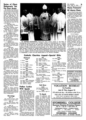 Series of Choir Rehearsals Set For Four Areas The Diocesan Choir Directors' Guild announces today that there will be a series of choir rehearsals being held in 4 areas of the Diocese during the next two weeks. In preparation for the May 20th Choir Festival to be held at Saint Mary's Cathedral, Fall River, music which will be used at the concelebrated Mass and workshop will be rehearsed. The dates and places for the rehearsals are: Fall River Area Holy Name Church, Thursday, May 10 at 7:30 P.M. St. Mary's Cathedral Chapel, Monday, May 14 at 7:30 P.M. Rehearsals will be conducted by Rev. William G. Campbell and Rev. Joaquim Da Silva. New Bedford Area St. Jarpes Church, Wednesday, May 9th. Rev. Henry Arruda and Rev. James McLellan will conduct the rehearsal. St. Joseph's Church, Monday, May 14th. John Danis will conduct the rehearsal. Taunton Area Sacred Heart Church, Monday, May 14th and Thursday, May 17th. Johanna Alden will conduct both rehearsals. Cape Area St. Francis Xavier Church, Thursday, May 10th. Geraldine Boles will conduct the rehearsal. It is expected that choir members planning to attend the Festival will take advantage of one of the two rehearsals in their area. Those wishing to attend both rehearsals are invited to do so. Sessions To date, 35 churches have reported over 400 choir members will participate in the choir festival. It is anticipated that many more churches will participate in the festival in oreler to study. church music, and to sing God's praises at the concelebrated ' Mass. A detailed account of the Choir Festival will be printed in a special article in The Anchor preceeding the May 20th Fes'. tival: In addition to::~he choral workshop, directed by J. Gerald Phillips, of Worcest~r, there will be a session. for c!lntors and song leaders given by Rev. Robert Gratt~rati, pastor of St. Anthony's Church, ~itchburg, and a session devoted:'to folk singers and guitarists given by Rene LePage ofSt. Patrick's Church, Somerset. " David R. Cat!ier, Cathedral organist and choirmaster, will hold .a group organ lesson for organists interested in perfecting their technique in choral and cantorial accompaniment.