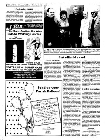 ton; SS. Peter and Paul, Fall River; and St. William's, Fall River, before being named pastor of St. Mary's parish, New Bedford, Nov. 12, 1980. His association with The Anchor is longstanding, beginning Nov. 23, 1967, when he started contributing a regular opinion column, "The Mooring." His appointment as editor Jan. 5, 1977, simply meant "moving over one column" to the editorial space, he explained to readers, while retaining the familiar "Mooring" logo. In addition to his pastorate and his editorship, Father Moore is diocesan director of communications and of the permanent diaconate program.