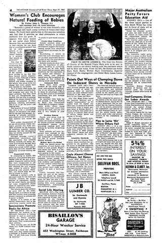approved private schools. . Under the Country party's new plan; the state would pay all interest on loans raised by. the independent schools for construction or expansion. The Country party based its demand for state aid to private schools on the "belief that continuance of the present dual system of State and Independent Schools operating in New South Wales is an integral part of a free community." The Australian Labor party, which is in' power in New South Wales, has taken an official stand opposing state aid to independent schools. Yet several leading FIlRST TO SOUTH AMERICA: The first two Sisters members of that party in..parliaof Charity of the Bless,ed Virgin Mary ever to be sent to ment expressed agreement with South America are shown looking over the continent which the Country party's new. prowill be their new home. From the left, the Sisters are Sister posals. One member of the state cabinet said a large number of Mary Ruth Marie; Mother Mary Consolatrice, Superior Laborites favor paying interest General of the congregation; and Sister Mary James Leone. on loans taken out by independent schools. NC Photo. 'Fhe third major party in New South Wales; the Liberal party., has not adopted a firm policy regarding aid to independent education. CARSON CITY (NC)-NevThe Attorney General issued a Auxiliary Bishop Thomas ada's attorney general ~as sug- n~ne-page statement' backing up Muldoon of Sydney said the gested. avenues of acbo~ for hIS conclusions, and followed Country party has revealed clampmg down on semmude this up with an ll-page memor- . "courage, wisdom and a' sense 01 sh?wS and. other indecent en~er- andum to the district and 'city justice." tamment m the state, parhcu- attorneys serving Las Vegas and larly in Las Vegas and Reno. Reno. Atty. Gen. Roger Foley issued Foley compared his position in two separate opinions and a the matter with the stand taken LOS ANGELES (NC) - The lengthy "memorandum" on the ?y Bishop Dwyer, saying that he subject from his capital city IS pot a policeman. But he sug- Kaiser Steel Corporation and the office here. In doing so he quoted gested that the Gaming Commis- United Steelworkers of America extensively from a recent passion use its powers, endowed by received the annual Father Coogan Award of the Catholie toral letter of Bishop Robe!rt J. the Legislature and defined by Dwyer of Reno that called for a the state Supreme Court, to "pro- Labor Institute here. The award, named for the late cleanup of indecent .floor shows tect the public health, safety' Thomas Coogan, the institute's in certain resort hotels and morals, good order and generai casinos in Nevada. . welfare of the inhabitants of' founder, is given' to a company and a union which have co'ntribThe Attorney General's stateNevada." uted to the search for industrial ments left the road open for a peace. possible crackdown to the GamEc:lgar F. Kaiser, president of ing Commission, the State LegisKaiser Industries Corp", and lature, or the local governments SYDNEY (NC) - In a city of Las Vegas and Reno. The two ,where' two stage shows recently David J. McDonald, president of cities were singled out because closed for lack of patrons, a 13th the union, accepted the awards some casinos in them present century liturgical drama, "The at a Communion breakfast attended by more than 1,000 per"bare bosom" shows and aHow Play of Daniel," has done amazsons. Gov. Edmund G. (Pat~ suggestive remarks by comeing business here, playing to Brown of California was the dians. crowded aui:liences in the crypt main speaker. Suitability Standards .of St. Mary's cathedral. Extra performances had to be Foley said the Gaming Commission, whose members are ap- arranged and seats were quickly pointed by the governor, "has taken up, despite the fact that the power to establish standards . all the dialogue was in Latin the of suitability for live .entertain- Church's universal language: (an ment offered the. public on English commentary was spoken by a narrator). premises of gaming licensees."
