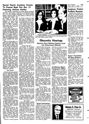 TRENTON (NC)-The' amount would have to protect the right of obscene material coming into of a free press as well as the New Jersey is on the increase, a rights of individuals. joint legislative commission Both he and Calissi suggested studying the problem of obscen- that changes in the law could be ity was told at the first of a geared toward the protection of series of public hearings here. . children because the Supreme The testimony was given by Court has indicated that legislaDetective Arthur Magnusson of tion in this area would hold up Expect Translation the Essex County prosecutor's under constitutional scrutiny. office, who is on leave of abBefore holding its hearing, the Of Mass Ordinary sence from that position to work commission mailed a six-page WASHINGTON (NC) - The as chief investigator for the questionnaire to 1,000 selected International Committee on f:ncommi&sion. law enforcement officials, eduMagnusson said that he found cators, professional people and glish in the Liturgy (lCEL) has completed a translation of the that obscene material is now clergymen soliciting their revised Order of Mass, followavailable in all areas of the views. ing a meeting in London. state, whereas only a few years Release - of the text will be ago the market was mostly in delayed until Oct. 25, accordthe larger cities. Archdiocese Opens i'ng to a spokesman, to allow A number of other law enfor an additional meeting in forcement officials were among Immigration Office London, Oct. 17-19, at which those testifying at the first hearMIAMI (NC) - An Office of ing and most were of the opinion Immigration Service has been es- representatives of major Christhat U. S. Supreme Court opin- tablished in the Miami archdio- tian churches of the Englishions ,in the obscenity field have cese by Archbishop Coleman F. speaking world will attempt to confused local law enforcement Carroll to aid immigrants and achieve common translations of the Gloria, the Apostles' and officials to the point where they refugees. . Nicene Creeds, the Lord's do not take action against obFather David Punch, gradu- Prayer, the Sanctus, and the scenity. ate of Pope John XXIII Semi- Agnus Dei. However, both former Essex It is expected that this joint County prosecutor Brendan T. nary for delayed vocations in Byrne and Bergen County prose- Weston, a onetime foreign ser- meeting will ' produce texts cutor Guy W. Calissi said they , vice officer with the U. S. State which can be used at least exhad never personally come Department, has been named perimentally for several years across evidence linking criminal director. The' office has head- by churches which approve behavior to the perusal of por- quarters in Centro Hispano them. . Catolico, archdiocesan Spanish nography. Center here. Protect Children Msgr. Bryan O. Walsh, resetThey did say that the com-路 tlement director for the Migramiss(ion should consult social tion and Refugee Service in the scientists on the question to see archdiocese, said various Catho. if antisocial behavior does stem lic agencies in south Florida from such material. have been dealing with immigraByrne also testified that, al- tion problems' for years. though pornography might be "Sorite 3,000 cases' handled aimed at the young by publish- last year by the Cahtolic Welfare ers, it has been his experience Bureau," he explained, "were that most of those interested in concerned with the resettlement it are adults. He warned that of refugees within the archdioany legislation enacted as a re- cese, assistance in reuniting famsult of the commission's study ilies and many other types of immigration problems."