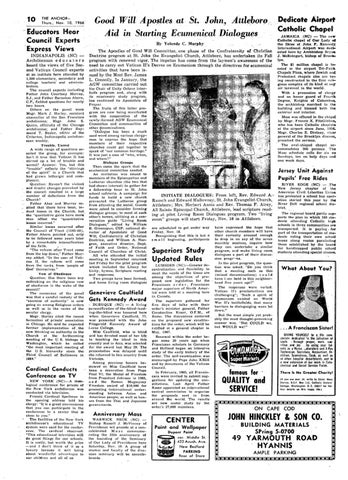 at an institute here attended by 1,500 elementary, secondary and college teachers- and adminis trators. ' the Chair of Unity Octave inter The council experts including faith program and,. along with Father John Courtney Murray, its missionary study program, S.J., and Father Barnabas Ahern, has continued its Apostolate of C.P., fielded questions for nearly Prayer. two hours. ' The fruits of this latter pro Others on the panel were Msgr. Mat"k J. Hurley, assistant gram are now being manifested chancellor of the San Francisco with the cooperation of the archdiocese; ,Msgr. John S. newly-formed AGW Ecumenical Quinn, ,officialis of the Chicago Committee and communities of other denominations. archdiocese; and F~ther Ray "Di<i'logue ,has been a much mond T. Bosler, editor of the used word among various clergy Criterion, Indianapolis archdioc men to express the hope that esan weekly. members of their respective Trouble, Unrest churches could get together to A wide range of questions as speak of "our common heritage." sailed the group, for example: It was just a case of "who, when, Isn't it true that Vatican II has and where?" stilTed up a lot of trouble and Dialogue Groups 'unrest? Answer: Yes, but this Then came the spark that the "trouble" reflects the "stirrings ecumenical committee needed. Jersey U'nit AgaDrilst of the spirit" in a Church that An invitation was issued to had grown lethargic and com members of the Episcopalian and Pupils' Free Rides placent. Lutheran churches (the two that, Question: Haven't the violent RIVER EDGE (NC) - ,The had shown i/lterest) to gather for and drastic changes provoked by New Jersey chapter of the a fellowship hour in St. John , the council resulted in a large school' cafeteria. A campaign for, American Civil Liberties Union INI'I'[ATE DIALOGUES: From left, Rev. Edward A.' has protested a school bus oper number, of defections from the funds to build' a new church Church? Rausch and Edward Mullowney, St. John Evangelist Church, ation started this year by 'the prevented the Luthel'an group Father Aher and Murray ,re- , from attending the social. Guests' Attleboro; Mrs. Herbert Annis and Rev. Thomas F. Airey,' River Dell regional school dis " plied that there have been, in trict. " were ,asked to consider forming All Saints Episcopal Church, Attleboro, lead scripture read-· " deed losses in. the Church, ,but dialogue groups; to meet at each The regional board partly sup ingat pilot Living Room Dialogues program. Two "living the "qualitative gains have more' other's homes, utilizing as a con ports the plan in which 100 stu than offset the "quantitative will start Friday, Nov. 18 in Attleboro. room" groups versation guide "Living Room dents attending Catholic high losses incur,red." Dialogues," edited by William schools in three communities are Similar losses occuned after B. Greenspun, CSP, national di have expressed the hope that are scheduled to get under way transpol'ted. It is paying. foJ' the Council of Trent (1545-63), other church members will have rectot; . of Apostolate of Good Friday, Nov. 18. part of the transportation of stu": Father Ahern pointed out, only Will, Conft'aternlty of Christian their curiosity aroused enough Recognizing that thi!! is but a dents riding their own schoo] to be followed some years later Doctrine, and William -A. Nor to drop in on any of the seven sma 11 beginning, participants buses along routes paralleling by a remarkable intensification monthly sessions, inquire how gren, executi ve director, Dept. those established by the board (If the faith. , they can undertake a similar of Faith and Order, National for handicapped public school "The 'reform after Trent came Council of Churches of Christ. program, and make living room, students attending special classes. from the top down," Father Mur dialogues a part of their discus- '