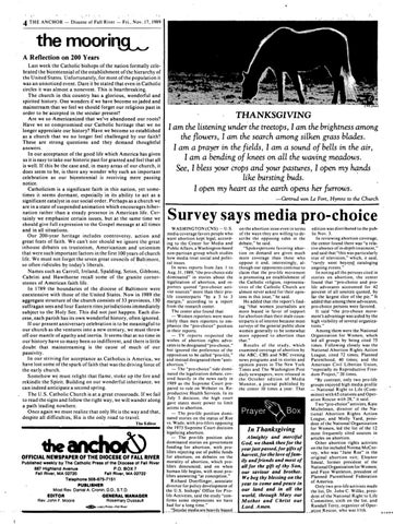 themoorin~ A Reflection on 200 Years Last week the Catholic bishops of the nation formally celebrated the bicentennial of the establishment ofthe hierarchy of the United States. Unfortunately, for most of the population it was an unnoticed event. Dare it be stated that even in Catholic circles it was almost a nonevent. This is heartbreaking. The church in this country has a glorious, wonderful and spirited history. One wonders if we have become so jaded and mainstream that we feel we should forget our religious past in order to be accepted in the secular present? Are we so -Americanized that we've abandoned our roots? Have we so compromised our Catholic heritage that we no 'longer appreciate our history? Have we become so established as a church that we no longer feel challenged by our faith? Thes~ are strong questions and they demand thoughtful answers. In our acceptance of the good life which America has given us it is easy to take our historic past for granted and feel that all is well. If this be the case and, in many areas of our church, it does seem to be, is there any wonder why such an important celebration as our bicentennial is receiving mere passing notice. ' Catholicism is a significant faith in this nation, yet sometimes it seems dormant, especially 'in its ability to act as a significant catalyst in our social order. Perhaps as a church we are in a state of suspended animation which encourages hibernation rather than a steady presence in American life. Certainly we emphasize certain issues, but at the same time we should give full expression to the Gospel message at all times and in all situations. Our 200-year heritage includes controversy, action and great feats of faith. We can't nor should we ignore the great inhouse debates on trusteeism, Americanism and unionism that were such important factors in the first 100 years of church life. We must not forget the seven great councils of Baltimore, so often rid'iculesb~ today's liberals. Names such as Carroll, Ireland, Spalding, Seton, Gibbons, Cabrini and Hawthorne recall some of the granite cornerstones of American faith life. In 1789 the boundaries of the diocese of Baltimore were coextensive with those of the United States. Now in 1989 the aggregate structure of the church consists of 33 provinces, 150 suffragan sees and four Eastern rites jurisdictions immediately subject to the Holy See. This did not just happen. Each diocese, each parish has its own wonderful history, often ignored. If our present anniversary celebration is to be meaningful to our church as she ventures into a new century, we must throw off our mantle of apathy and inertia. It seems that at no time in our history have so many been so indifferent, and there is little doubt that mainstreaming is the cause of much' of our passivity. In our striving for acceptance as Catholics is America, we' have lost some of the spark of faith that was the driving force of the early church. Somehow we must relight that flame, stoke up the fire and rekindle the Spirit. Building on our wonderful inheritance, we can indeed anticipate a second spring. The U.S. Catholic Church is at a great crossroads. If we fail to read the signs and follow the right way, we wiUwander along a path leading nowhere. Once again we must realize that only He is the way and that, despite all difficulties, His is the only road to travel. The Editor