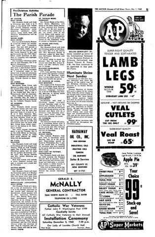 The Parish Parade ST. THOMAS MORE. ST. JOSEPH. SOMERSET FALL RIVER Rev. Robert Healy of the GlenThe Women's Guild will hold • Christmas sale from 2 to 9 mary Home Missioners will today in the parish hall. Tables speak to the Holy Name Society will feature religious articles, at their meeting 8:15 Tuesday night, Dec. 6. He will speak of Christmas decorations, white the work of his community in elephants, children's items, aprons, fancy work, food, and the "no priest" area of the ceramics. Refreshments will be United States with special reference to present segregation available. problems. He is at present staNOTRE DAME, . tioned at the Glenmary house FALL RIVER of studies in Fairfield, COIUl. The Council of Catholic Women Is accepting orders for holiday SS. PETER AND PAUL, fruit cake and Trappistine FALL RIVER candy. The unit will sponsor a The Women's Guild will hold party tomorrow night in the its· Christmas party at 6:30 MonIChool hall for the parish Cathday night, Dec. 5 in the church olic Youth Council. A skit and hall. Mrs. Raymond Dooley is performance by the CYO Boys' chairman, aided by Miss MauChoir under direction of Rev. reen McCloskey. Members will Paul G. Connolly will highlight bring prizes. entertainment. A special whist is slated for The members' Christmas party Monday, Dec. 12, also in the will be held Thursday, Dec. 8 at . church hall with Mrs. Arthur E. White's Restaurant. Duffy and Mrs. Edward JohnThe Council of Catholic Women son in charge. will hold a semi-formal Christ- BLESSED SACRAMENT. mas party for parish teenagers FALL RIVER at 7 tomorrow night in the CYO, Cubs and Boy Scouts of school hall. A skit and selections the parish will sponsor a turkey by Immaculate Conception Glee whist at 7:30 Saturday night, Club will highlight the program. Dec. 3 in the lower church. ProMrs. Wilfred Garand ·is chair- ceeds will benefit the parish. man. ST. FRANCIS OF ASSISI, ST. JAMES, .NEW BEDFORD NEW BEDFORD The League of S1. Francis will Monsignor Noon Circle will sponsor a giant penny sale for hold a Christmas party Monday, , the benefit of the parish Tuesday Dec. 19 with Mrs. Peter Blair as chairman. Corporate Communand Wednesday, Dec. 6 and 'l in the church hall. Mrs. Leo ;T. ion is set for 9:S0 Mass this SunTelesmanick will be chainnan. day morning. A Spring dance . Next regular meeting is set will be held in April HOLY GHOST. for Tuesday, Dec. 20, when a Christmas play will be presented ATrLEBORO Parishioners will hold a by the Catholic Theatre Guild. Christmas bazaar ton i g h t ST. DOMINIC, through Saturday night at the SWANSEA church hall, Prairie Avenue. A The Women's Guild annual penny sale will also be held each Christmas bazaar and ham and. night. Handmade. articles will be bean supper will be held this fea tured and there will be a Saturday from 11 o'clock on in children's treat Saturday afterK of C Hall, Swansea. Mrs. noon. Dave Foley heads the Lloyd Jarvis is chairman, aided committee planning the event. by Miss -Dorothy Pires as coST. ,PATRICK,' ' 'chairman. She announces that FALMOUTH the supper will be at 6:30 and The Women's Guild will spon_ reservations may be made with sor a Christmas bazaar from :& Mrs. Eileen Enos, ticket chairto 5 Saturday afternoon, Dec. 3 man-;-or by calling at S1. Domat the parish hall. Mrs. NormaD. inic's rectory. Starasta and Mrs. John ;T. FarThe unit's annual Christmas rell are co-chairmen. party is set for Tuesday, Dec. IS at the Jolly Miller in Swansea. ST. MICHAEL, Reservations should be made OCEAN GROVE The Catholic Women'. Club with guild officers by today. will hold a Christmas party Gifts will be exchanged. Monday, Dec. 12 in the school ST. PAUL, hall. Reservations should be TAUNTON made by Wednesday, Dec. 7, also The Women's Guild will hold at thf'l school hall. A drawing a Christmas pot luck sUpper and for members who have donated Yankee Swap at 6:30 Tuesday to the party will be a feature of night, Dec. 6 in the churchhaU. the evening. Christmas carols will be sung OUR LADY OF VICTORY. by the parish's SO-member junCENTERVILLE lor choir. Mrs. Hector Demerll The Women's Guild will donand Mrs. Arthur Medeiros are ate $100 towards the Bishop'. eo-chairmen. . Charity Ball in January. Other New Year events will include 1961 !,Ictivities will include ruma white elephant auction and mage and food sales, a coveredsale in January and a book: fair dish supper, a coffee brunch, a in February. bazaar and a fashion show. Gifts will be exchanged at the SACRED HEART, December meeting, which will FALL RIVER The Women's Guild will hold feature 'the annual Christmas its Christmas party at 8 Monday party. night, Dec. 5 in the schoQl hall. The Fall River CYO Glee Club under the direction of Rev. Paul G. Connolly will be featured.
