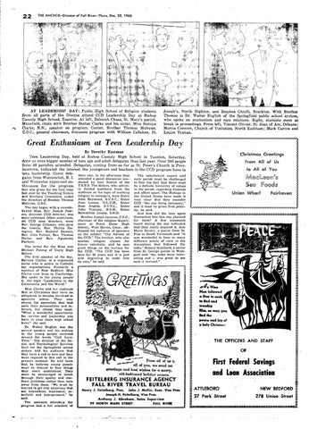 Great Enthusiasm at Teen Leadership Day By Dorothy Eastman Teen Leadership Day, held at Bishop Cassidy High School in Taunton, Saturday, drew an even bigger number of teen age and adult delegates than last year. Over 300 people from 40 parishes attended. Delegates, coming from as far as St. Peter's Church in Prov incetown, indicated the interest the youngsters and teachers in the CCII program have in teen leadership. GU€'st dele their own. In the afternoon they The catechetical expert said gates from Woonsocket, R. 1. attended a panel discussion con each parish must be challenged and 'Vorcester expre 3sed en ducted by four Sisters of the to face the fact that there must be a definite hierarchy of values thusiasm for the program T.S.B.S. The Sisters, who adroit that was given for the first time last year by the Teaching Sisters and Brothers Committee, under the direction 9f Brother Thomas Mulryan, C.S.C. The day began with a concele brated Mass. Rev. Joseph Pow ers, diocesan CCD director, was main celebrant. Other celebrants, all CCD area directoJ's, were Rev. George Coleman, who gave the homily, Rev. Phillip Da vignon, Rev. Richard Demers, Rev. John FoIster, Rev. Thomas Neilan and Rev. Agostinho Pacheco. The lector for the Mass was Michael Felong of Coyle High School. - . The first speaker of the day, Bernice Clarke, is a registered nurse who is active in Catholic lay organizations. Formerly' a resident of New Bedford, Miss Clarke -now lives in Cambridge. She spoke to the young people .01- the topic "Leadership in the Community and the World." Miss Clarke told her audience that as Christians they have an obligation to become involved in apostolic action. They may choose the apostolate that best suits their personalities and in terests, but choose they must. "What a wonderful opportunity for service and leadership you have in .your daily high school lives!" she said . .Dr. Walter English was ,the second speaker and his address to the young people centered around the words "Call. Love. Time." The director of the So cial and Psychological Services Unit for the Springfield school system told his audience that they have a call to love and they must respond to this call in the present moment. He t01<l them that he believes young people must be trained to face things they don't understand. They must be encouraged to break through their apathy and con front problems rather than tum away from them. "We must be trained to get into situatio:ns that are interethnic, interracial. in terfaith and interpersonal.'· he said. The sponsors attending the ~rogram had a full schedule of