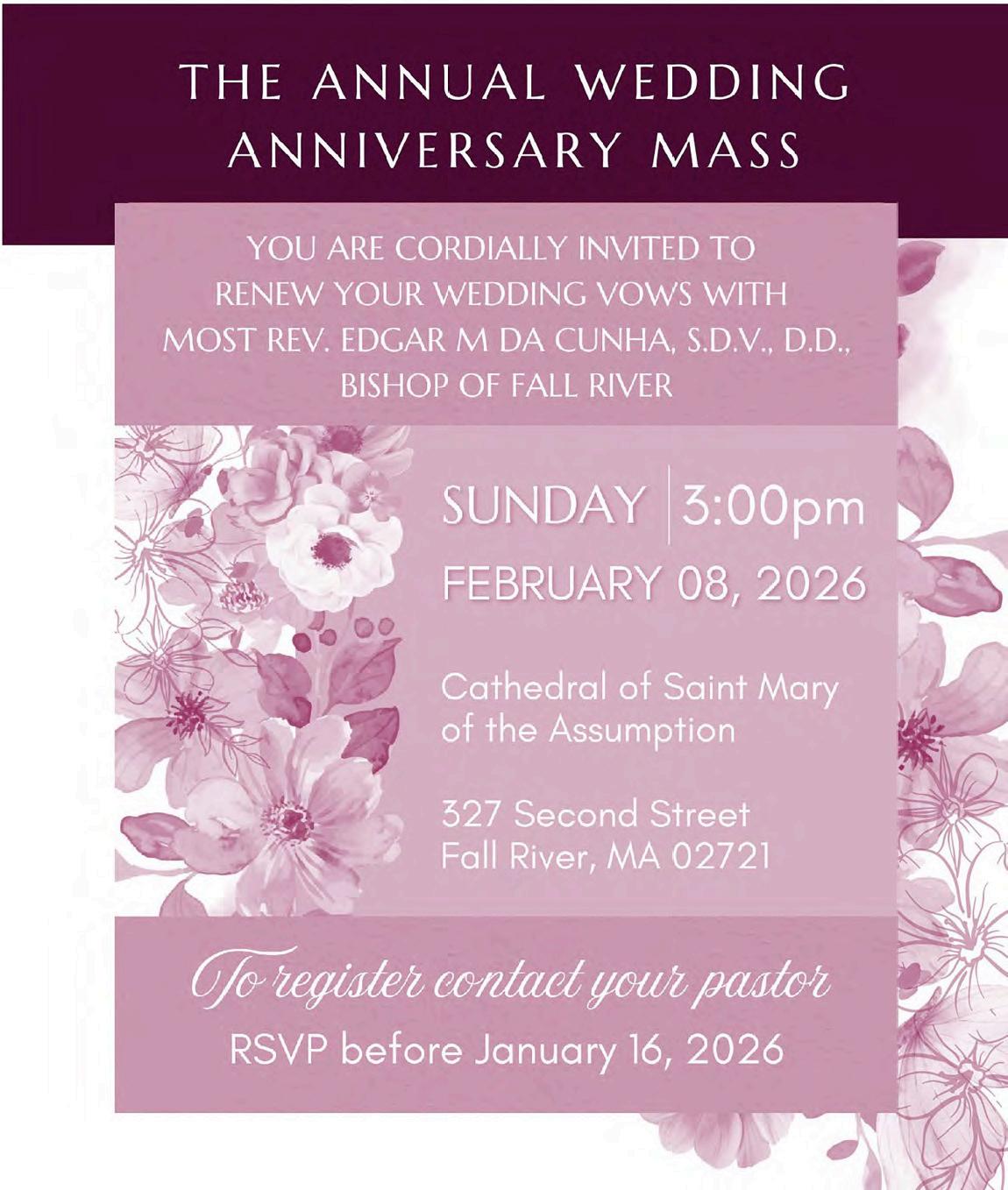 Effective January 2026, the Diocese will discontinue its Television Mass aired weekly on WLNETV, Channel 6. The final TV Mass will be broadcast at 11 a.m. on Sunday, December 28, 2025. The Diocese has posted information on its website fallriverdiocese. org on accessing Sunday Mass via livestream options and broadcast and cable television.