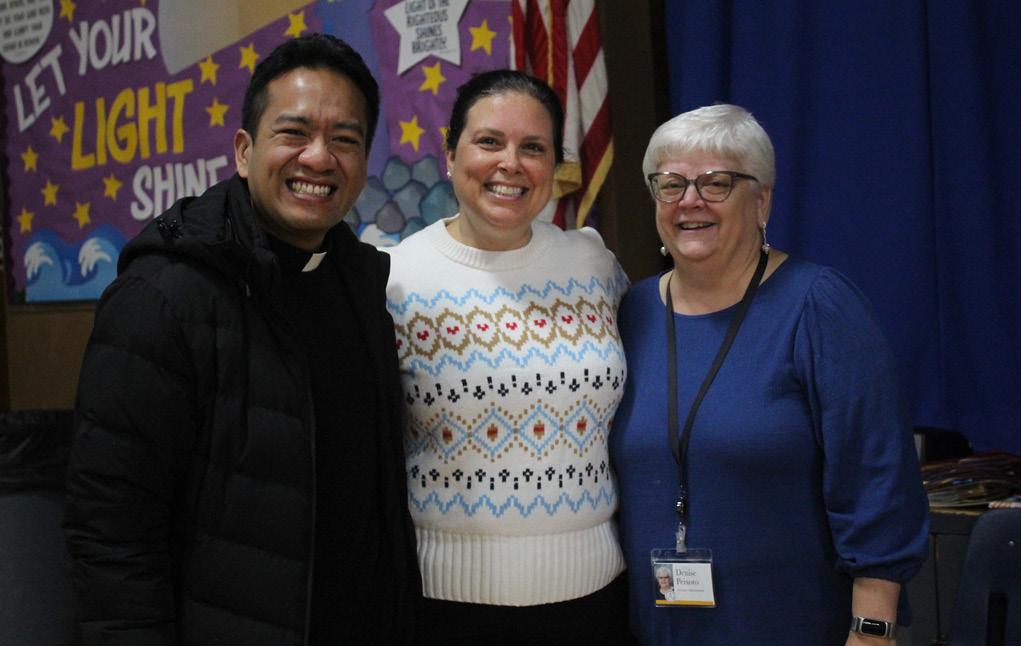 Faculty, staff and students at St. Joseph School in Fairhaven celebrated National Principal Day by honoring their principal, Tara Frost. Speeches, words of gratitude and gifts were presented to her at morning prayer. Pictured , left to right: Father Maiki Kamauoha, SS.CC pastor, Tara Frost and Diocesan Assistant Superintendent of Schools, Denise Peixoto.