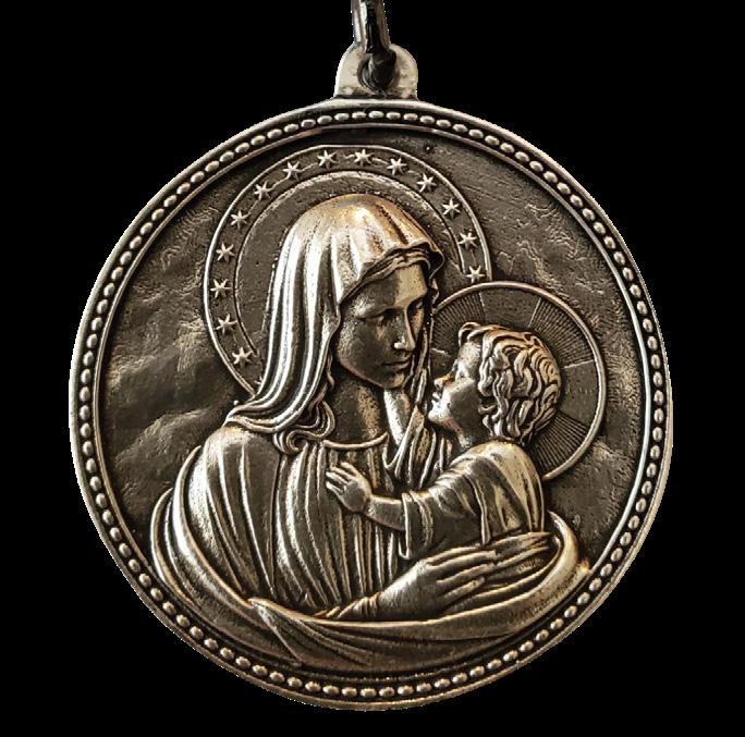 The Marian Award is a pewter medal embossed with a Madonna and Child Jesus image on one side and the Fall River Diocesan coatof-arms on the other.