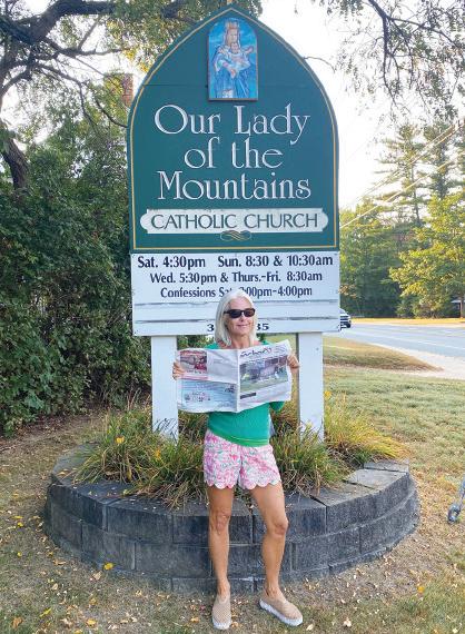 Pictured: Anchor Editor Joan Warren reads The Anchor in front of Our Lady of the Mountains Catholic Church in North Conway, NH.