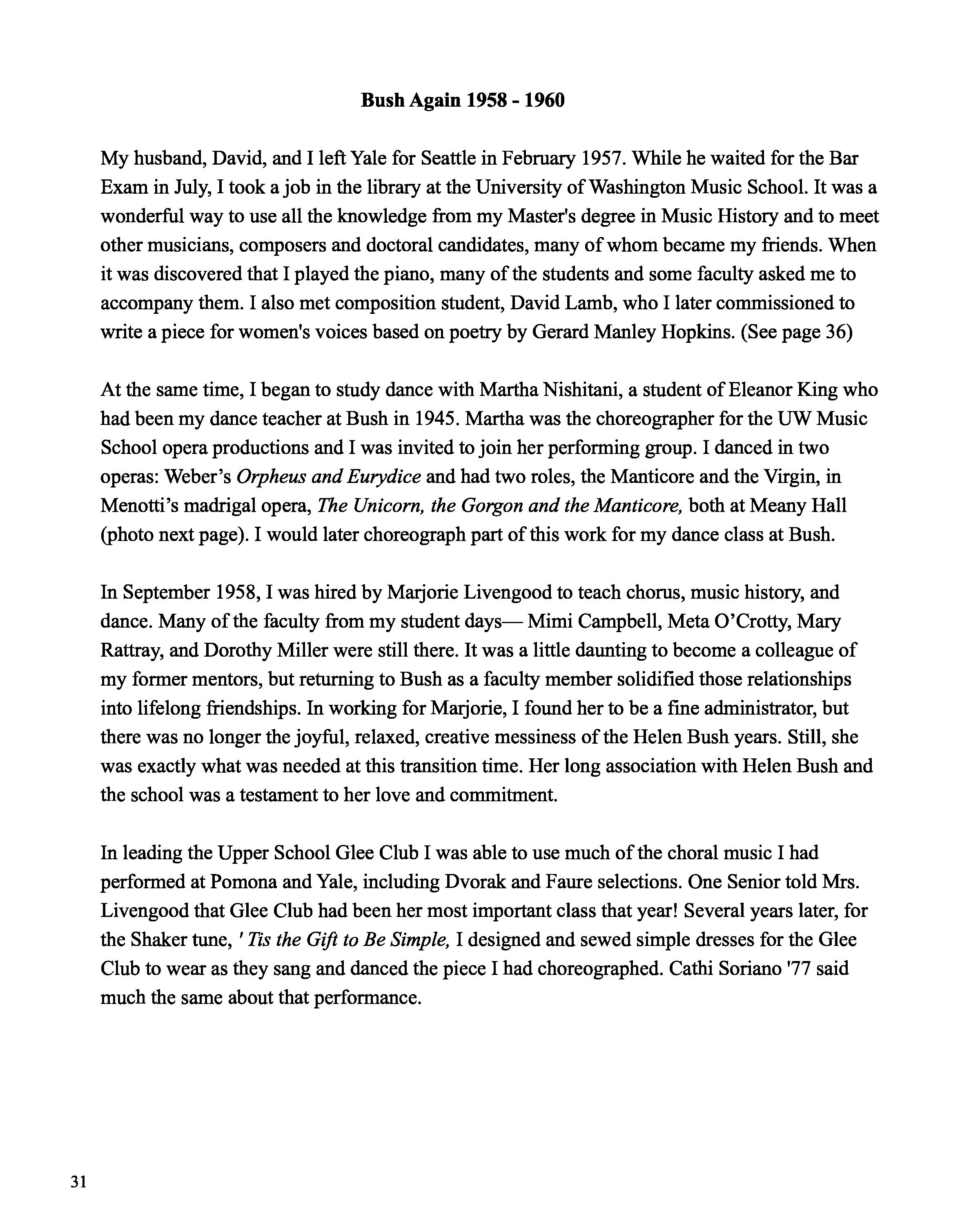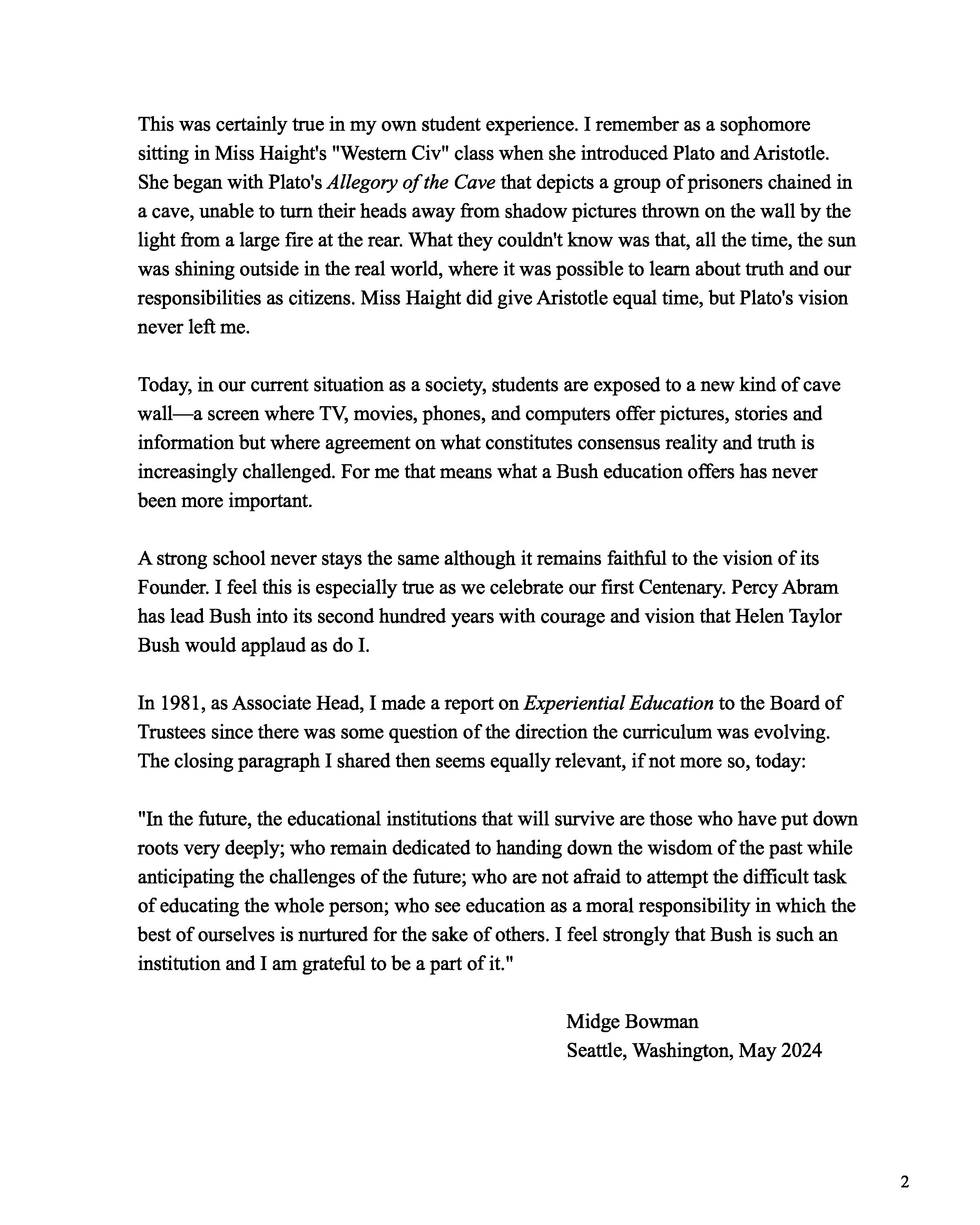 My Bush story, which began at age twelve and continued as an alumna, faculty member, division head, parent of two Bush alums and ultimately Interim Head of School, is suddenly no longer solely about me and my experience. It has become a story of our growth as a community. In those early days of coeducation with John Grant and Les Larsen, our small school-while building on Helen Bush's legacy-was actually creating an enlarged and expanded vision: a new name and a new identity in the midst of challenging social issues and ground-breaking ideas in education, psychology and the arts. From my current perspective at ninety, I value even more the breadth of that curriculum and our impact on the broader community where we were brave enough to envision our small school in a larger context.