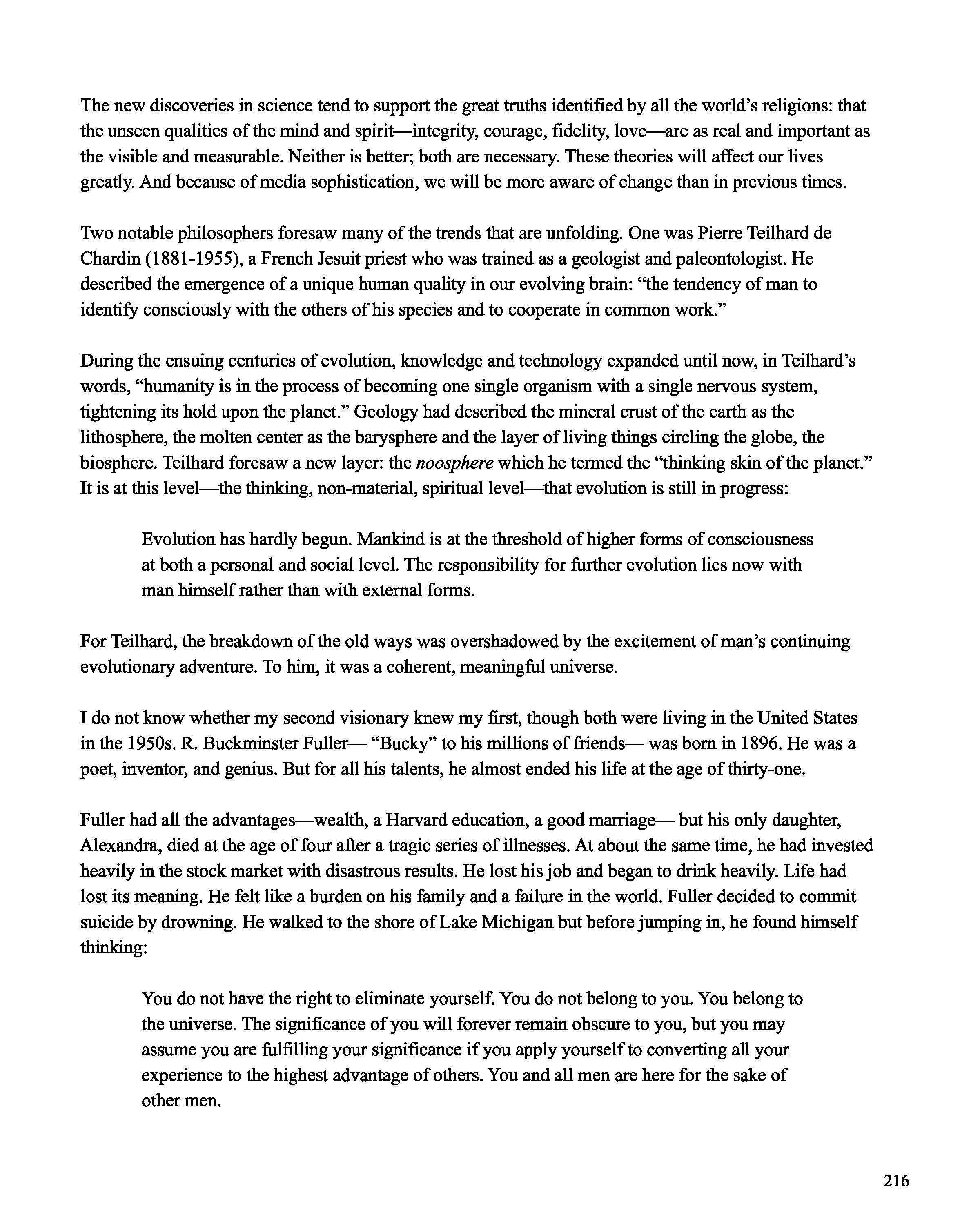 What is needed now is hope, a sense of adventure about the future, a commitment to the well-being of all people, a love of our planet and a faith in the larger truths that science and religion are continuing to unfold. The next decade will see a crisis of nerve and will. We will need reasons for a hope and faith to carry us through the transition time. People like Fuller, Teilhard and many more have given us those examples and reasons.