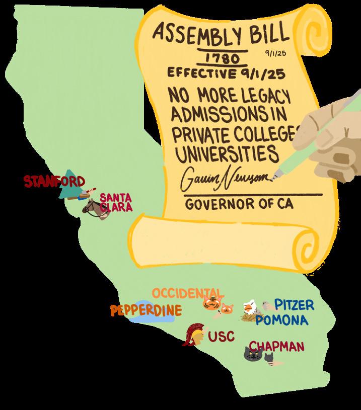 This fall, Menlo juniors applying to private colleges and universities in California will encounter a different playing field than those before them. In September 2024, California Gov. Gavin Newsom signed into law Assembly Bill 1780, which will prohibit California private colleges and universities from giving special consideration to students in the class of 2026 and forward with personal connections to the school. However, it is unclear whether the ban will have the desired effect given the lack of any financial penalty.