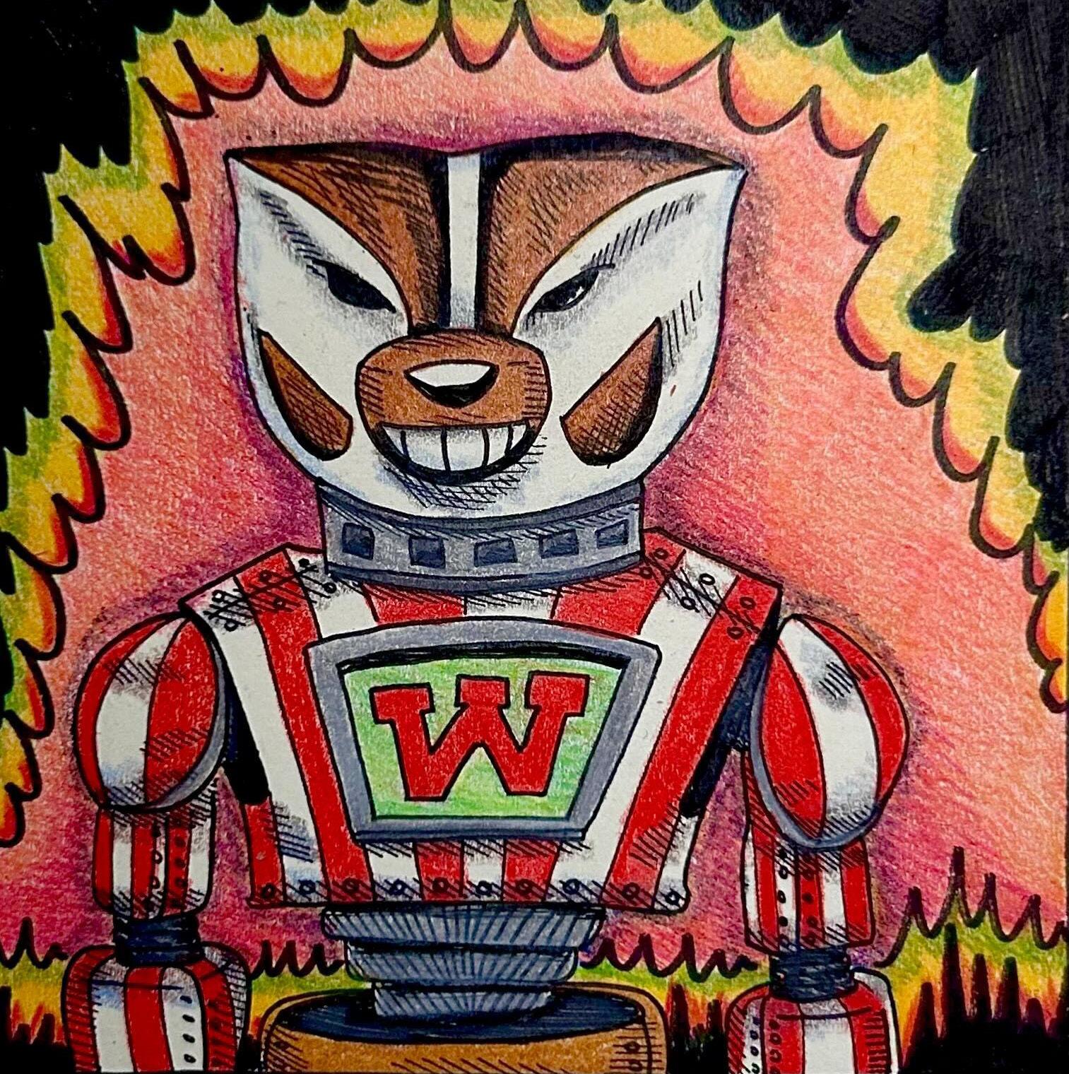 My primary adjustment was making the AI Bucky Badger more recognizable and less like a panda. I also used colored pencil in order to give the drawing a more human touch and visually interesting texture. I actually liked a lot of the cyborg detials, so I focused on fusing them with Bucky’s design to allow the entire piece and color scheme to read more like him.