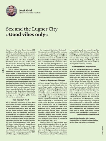Ich brate selbst mit Olivenöl So ist das Ganze selbstverständlich nie passiert. Als er sich zu mir aufs Bett setzte, sagte ich: Nett hast du’s hier. Dann schmusten wir ein bisschen und ich ging nach Hause. Ich weiß ja selbst nicht, wie man richtig wohnt. InteriorDesign-Blogs behaupten gerne, die Wohnung sei der Spiegel der Seele. Sollte das wirklich stimmen, wäre ich ein ziemliches Arschloch. Was bei Dorian Gray noch ein Gemälde auf seinem Dachboden war, ist bei mir bereits eine raumgreifende Installation, mixed media, courtesy of myself. Bevor sich auf dem Weg vom Bade- ins Schlafzimmer nicht mindestens ein vollständiges Birchermüsli auf meinen Fußsohlen ansammelt, hole ich den Staubsauger erst gar nicht aus dem Abstellraum. T-Shirts einrollen habe ich genau einen Tag durchgehalten, außerdem brate ich mit Olivenöl. Vielleicht sollten sich Leute, die etwas zu intensiv feine Unterschiede sezieren, öfter mal vor Augen halten: »Live love laugh«. Am Ende zählen »Good vibes only« im »Home sweet home«. Schaut auch gut aus in einer kleinen LED-Lichtbox. joechl@thegap.at • @knosef4lyfe Josef Jöchl ist Comedian. Sein Programm »Nobody« feiert im Herbst Premiere. Alle Solotermine findet man unter www.knosef.at. Ari Y. Richter